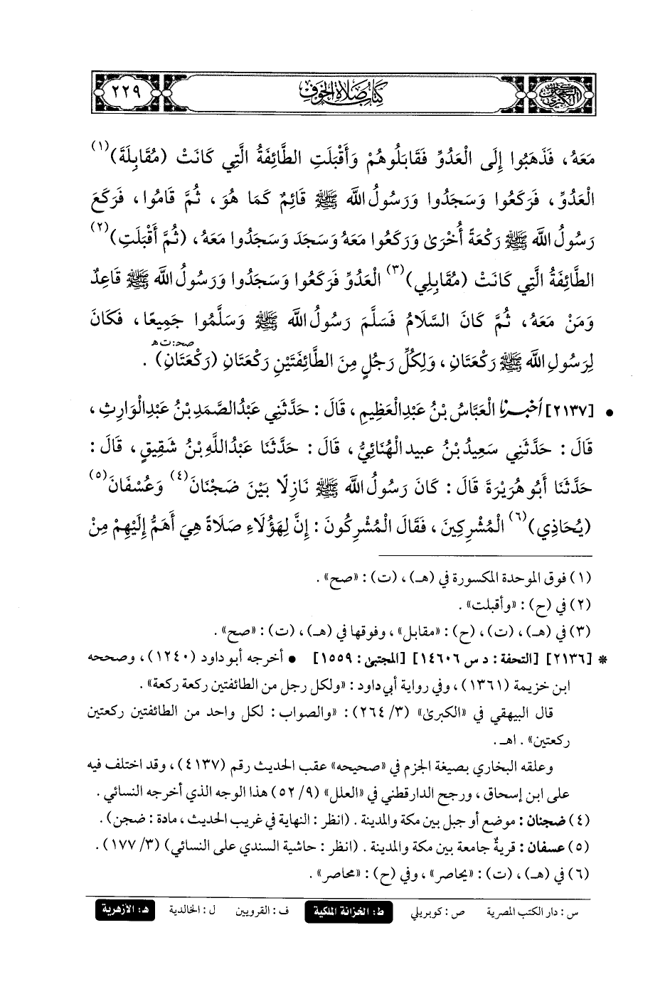 2137- أَخبَرنا العَبَّاسُ بنُ عَبدِ العَظِيمِ، قَالَ: حَدَّثَنِي عَبدُ الصَّمَدِ بنُ عَبدِ الوَارِثِ، قَالَ: حَدَّثَنِي سَعِيدُ بنُ عُبَيدٍ الهُنَائِيُّ، قَالَ: حَدثنا عَبدُ اللهِ بنُ شَقِيقٍ، قَالَ: حَدثنا أَبُو هُرَيرَةَ، قَالَ: كَانَ رَسُولُ اللهِ صَلى الله عَليه وسَلم نَازِلاً بَيْنَ ضَجْنَانَ وَعُسْفَانَ، يُحَاذِي المُشْرِكِينَ، فَقَالَ المُشْرِكُونَ: إِنَّ لِهَؤُلاَءِ صَلاَةً هِيَ أَهَمُّ إِلَيْهِمْ مِنِ أَبْنَائِهِمْ وَأَبْكَارِهِمِ، أَجْمِعُوا أَمْرَكُمْ، ثُمَّ مِيلُوا عَلَيْهِمْ مَيْلَةً وَاحِدَةً، فَجَاءَ جِبْرِيلُ فَأَمَرَهُ أَنْ يُقَسِّمَ أَصْحَابَهُ نِصْفَيْنِ، يُصَلِّي بِطَائِفَةٍ مِنْهُمْ، وَطَائِفَةٌ مُقْبِلُونَ عَلَى عَدُوِّهِمْ قَدْ أَخَذُوا حِذْرَهُمْ وَأَسْلِحَتَهُمْ، فَيُصَلِّي بِهِمْ رَكْعَةً، ثُمَّ يَتَأَخَّرُ هَؤُلاَءِ، وَيَتَقَدَّمُ أُولَئِكَ، فَيُصَلِّي بِهِمْ رَكْعَةً، تَكُونُ لَهُمْ مَعَ النَّبِيِّ صَلى الله عَليه وسَلم رَكْعَةً رَكْعَةً، وَلِلنَّبِيِّ صَلى الله عَليه وسَلم رَكْعَتَانِ.