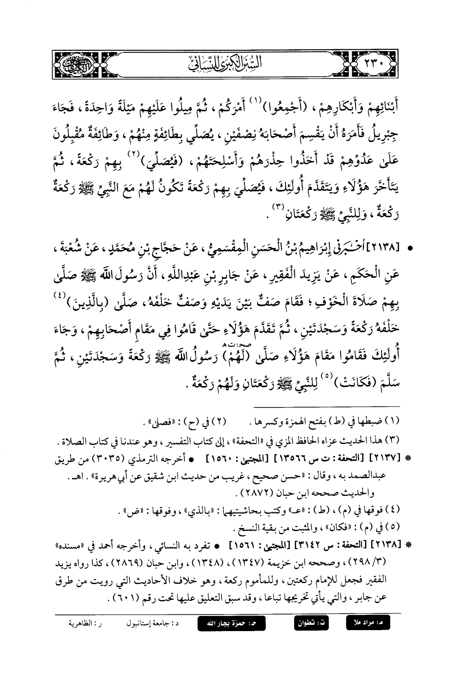 2138- أَخبَرني إِبرَاهِيمُ بنُ الحَسَنِ المِقْسَمِيُّ، عَنْ حَجَّاجِ بْنِ مُحَمدٍ، عَنْ شُعبَةَ، عَنِ الحَكَمِ، عَنْ يَزِيدَ الفَقِيرِ، عَنْ جَابِرِ بْنِ عَبدِ اللهِ، أَنَّ رَسُولَ اللهِ صَلى الله عَليه وسَلم صَلَّى بِهِمْ صَلاَةَ الخَوْفِ، فَقَامَ صَفٌّ بَيْنَ يَدَيْهِ، وَصَفٌّ خَلْفَهُ، صَلَّى بِالَّذِينَ خَلْفَهُ رَكْعَةً وَسَجْدَتَيْنِ، ثُمَّ تَقَدَّمَ هَؤُلاَءِ حَتَّى قَامُوا فِي مَقَامِ أَصْحَابِهِمْ، وَجَاءَ أُولَئِكَ فَقَامُوا مَقَامَ هَؤُلاَءِ، صَلَّى لَهُمْ رَسُولُ اللهِ صَلى الله عَليه وسَلم رَكْعَةً وَسَجْدَتَيْنِ، ثُمَّ سَلَّمَ فَكَانَ لِلنَّبِيِّ صَلى الله عَليه وسَلم رَكْعَتَانِ وَلَهُمْ رَكْعَةٌ.