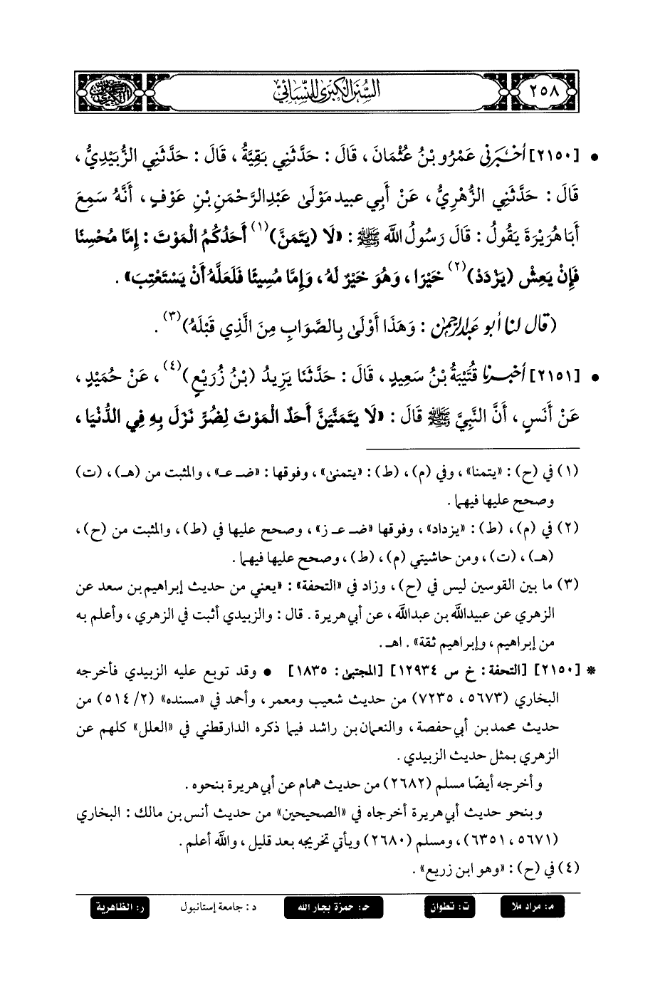 2150- أَخبَرني عَمرُو بنُ عُثْمَانَ، قَالَ: حَدثنا بَقِيَّةُ، قَالَ: حَدَّثَنِي الزُّبَيْدِيُّ، قَالَ: حَدَّثَنِي الزُّهْرِيُّ، عَنْ أَبِي عُبَيدٍ، مَوْلَى عَبدِ الرَّحْمَنِ بْنِ عَوْفٍ، أَنَّهُ سَمِعَ أَبَا هُرَيرَةَ، يَقُولُ: قَالَ رَسُولُ اللهِ صَلى الله عَليه وسَلم: لاَ يَتَمَنَّ أَحَدُكُمُ المَوْتَ، إِمَّا مُحْسِنًا فَإِنْ يَعِشْ يَزْدَدْ خَيْرًا، وَهُوَ خَيْرٌ لَهُ، وَإِمَّا مُسِيئًا فَلَعَلَّهُ أَنْ يَسْتَعْتِبَ.