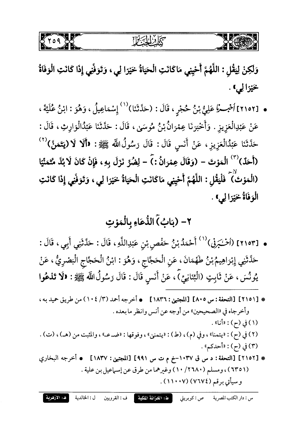 2152- أَخبَرنا عَلِيُّ بنُ حُجْرٍ، قَالَ: حَدثنا إِسْمَاعِيلُ، وَهُوَ ابنُ عُلَيَّةَ، عَنْ عَبدِ العَزِيزِ (ح) وَأَخبَرنا عِمْرَانُ بنُ مُوسَى، قَالَ: حَدثنا عَبدُ الوَارِثِ، قَالَ: حَدثنا عَبدُ العَزِيزِ، عَنْ أَنَسٍ، قَالَ: قَالَ رَسُولُ اللهِ صَلى الله عَليه وسَلم: أَلاَ لاَ يَتَمَنَّ أَحَدٌ المَوْتَ وقال عمران لِضُرٍّ نَزَلَ بِهِ، فَإِنْ كَانَ لاَ بُدَّ مُتَمَنِّيًا المَوْتَ، فَلْيَقُلِ: اللهُمَّ أَحْيِنِي مَا كَانَتِ الحَيَاةُ خَيْرًا لِي، وَتَوَفَّنِي إِذَا كَانَتِ الوَفَاةُ خَيْرًا لِي.