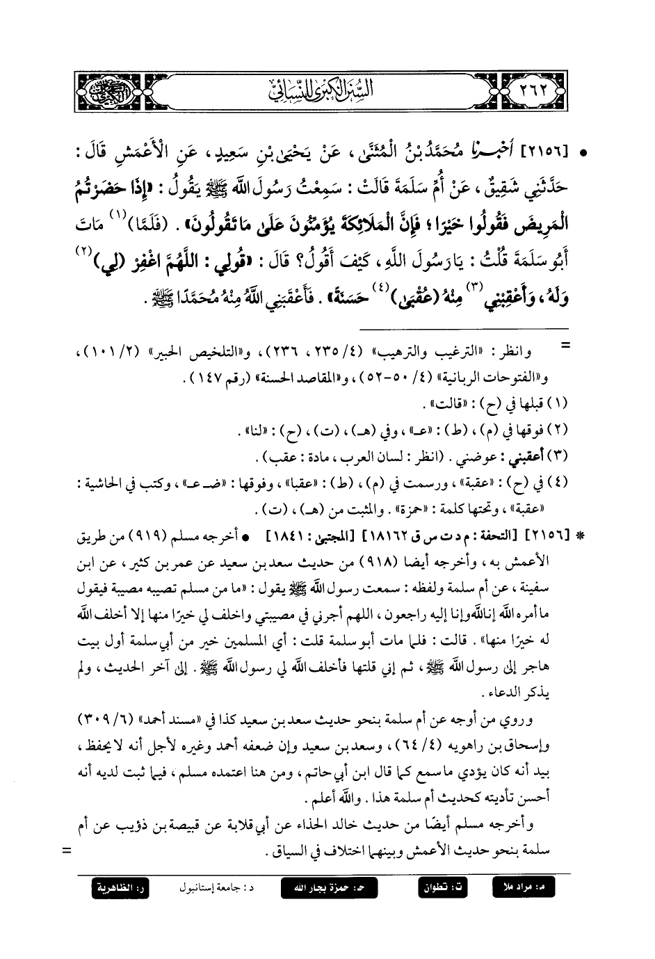 2156- أَخبَرنا مُحَمدُ بنُ المُثَنَّى، عَنْ يَحيَى بْنِ سَعِيدٍ، عَنِ الأَعْمَشِ، حَدَّثَنِي شَقِيقٌ، عَنْ أُمِّ سَلَمَةَ، قَالَتْ: سَمِعْتُ رَسُولَ اللهِ صَلى الله عَليه وسَلم يَقُولُ: إِذَا حَضَرْتُمُ المَرِيضَ فَقُولُوا خَيْرًا، فَإِنَّ المَلاَئِكَةَ يُؤَمِّنُونَ عَلَى مَا تَقُولُونَ، فَلَمَّا مَاتَ أَبُو سَلَمَةَ، قُلْتُ: يَا رَسُولَ اللهِ، كَيْفَ أَقُولُ؟ قَالَ: قَوْلِي: اللهُمَّ اغْفِرْ لِي وَلَهُ، وَأَعْقِبْنِي مِنْهُ عُقْبَى حَسَنَةً، فَأَعْقَبَنِي اللهُ مِنْهُ مُحَمدًا صَلى الله عَليه وسَلم.