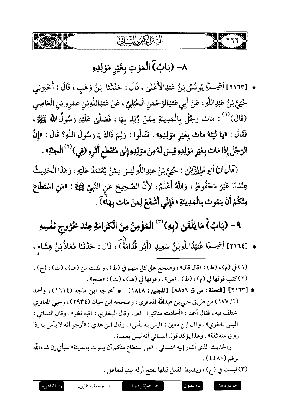 2163- أَخبَرنا يُونُسُ بنُ عَبدِ الأَعْلَى، قَالَ: حَدثنا ابنُ وَهْبٍ، قَالَ: أَخبَرني حُيَيُّ بنُ عَبدِ اللهِ، عَنْ أَبِي عَبدِ الرَّحْمَنِ الحُبُلِيِّ، عَنْ عَبدِ اللهِ بْنِ عَمْرِو بْنِ العَاصي، قَالَ: مَاتَ رَجُلٌ بِالمَدِينَةِ مِمَّنْ وُلِدَ بِهَا، فَصَلَّى عَلَيْهِ رَسُولُ اللهِ صَلى الله عَليه وسَلم، فَقَالَ: يَا لَيْتَهُ مَاتَ بِغَيْرِ مَوْلِدِهِ، فَقَالُوا: وَلِمَ ذَاكَ يَا رَسُولَ اللهِ؟ قَالَ: إِنَّ الرَّجُلَ إِذَا مَاتَ بِغَيْرِ مَوْلِدِهِ قِيسَ لَهُ مِنْ مَوْلِدِهِ إِلَى مُنْقَطَعِ أَثَرِهِ فِي الجَنَّةِ.