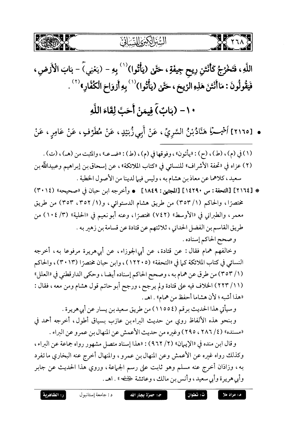 2165- أَخبَرنا هَنَّادُ بنُ السَّرِيِّ، عَنْ أَبِي زُبَيْدٍ، عَنْ مُطَرِّفٍ، عَنْ عَامِرٍ، عَنْ شُرَيْحِ بْنِ هَانِئٍ، عَنْ أَبِي هُرَيرَةَ، قَالَ: قَالَ رَسُولُ اللهِ صَلى الله عَليه وسَلم: مَنْ أَحَبَّ لِقَاءَ اللهِ أَحَبَّ اللهُ لِقَاءَهُ، وَمَنْ كَرِهَ لِقَاءَ اللهِ كَرِهَ اللهُ لِقَاءَهُ، قَالَ شُرَيْحٌ: فَأَتَيْتُ عَائِشَةَ فَقُلْتُ: يَا أُمَّ المُؤْمِنِينَ، سَمِعْتُ أَبَا هُرَيرَةَ يَذْكُرُ عَنْ رَسُولِ اللهِ صَلى الله عَليه وسَلم حَدِيثًا إِنْ كَانَ كَذَلِكَ فَقَدْ هَلَكْنَا، قَالَتْ: وَمَا ذَاكَ؟ فَقُلْتُ: مَنْ أَحَبَّ لِقَاءَ اللهِ أَحَبَّ اللهُ لِقَاءَهُ، وَمَنْ كَرِهَ لِقَاءَ اللهِ كَرِهَ اللهُ لِقَاءَهُ، وَلَيْسَ مِنَّا أَحَدٌ إِلاَّ وَهُوَ يَكْرَهُ المَوْتَ، قَالَتْ: قَدْ قَالَهُ رَسُولُ اللهِ صَلى الله عَليه وسَلم، وَلَكِنْ لَيْسَ بِالَّذِي تَذْهَبُ إِلَيْهِ، وَلَكِنْ إِذَا طَفحَ البَصَرُ، وَحَشْرَجَ الصَّدْرُ، وَاقْشَعَرَّ الجِلْدُ، فَعِنْدَ ذَلِكَ مَنْ أَحَبَّ لِقَاءَ اللهِ أَحَبَّ اللهُ لِقَاءَهُ، وَمَنْ كَرِهَ لِقَاءَ اللهِ كَرِهَ اللهُ لِقَاءَهُ.