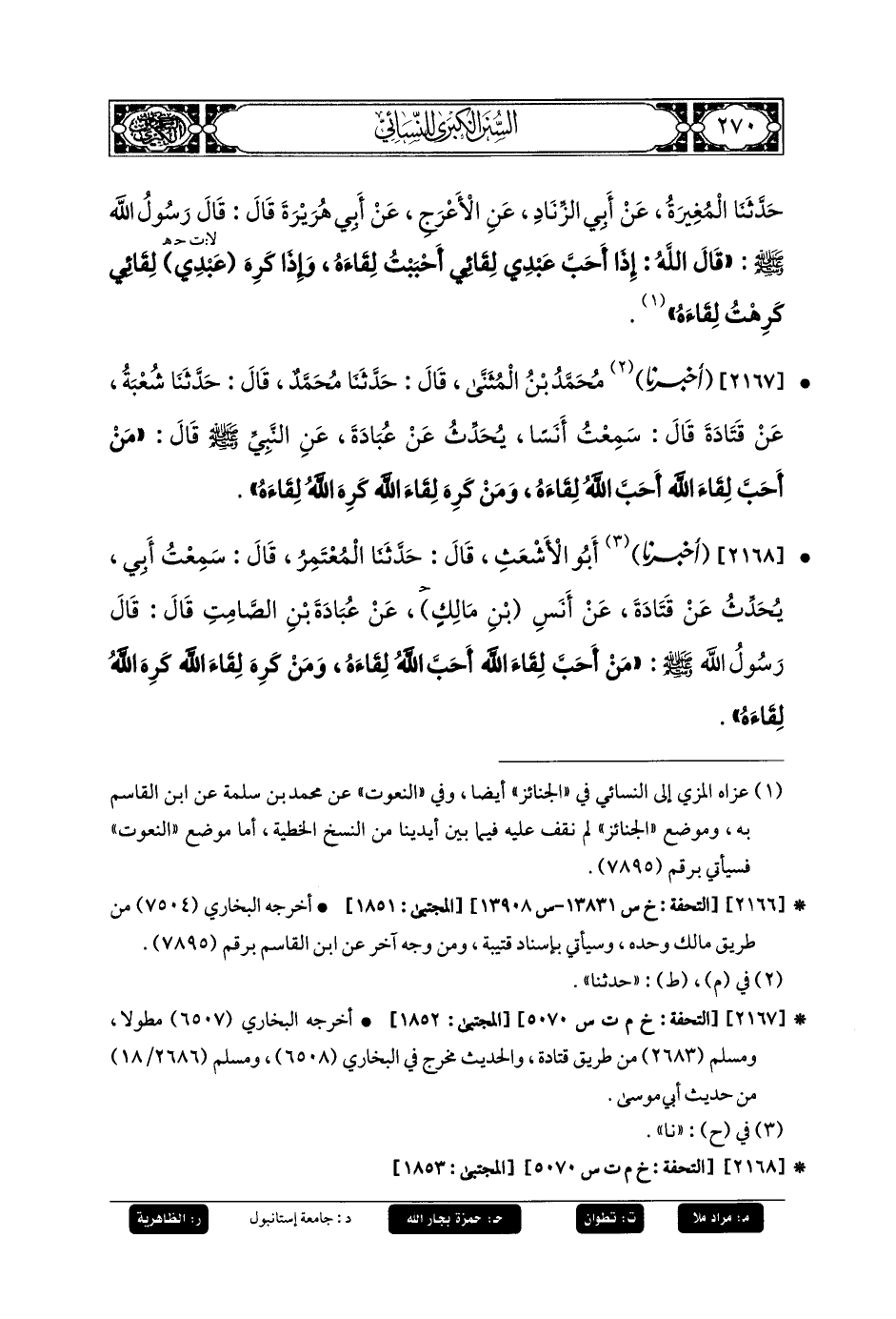 2168- أَخبَرنا أَبُو الأَشْعَثِ، قَالَ: حَدثنا المُعْتَمِرُ، قَالَ: سَمِعْتُ أَبِي يُحَدِّثُ عَنْ قَتَادَةَ، عَنْ أَنَسٍ بن مالك، عَنْ عُبَادَةَ بْنِ الصَّامِتِ، قَالَ: قَالَ رَسُولُ اللهِ صَلى الله عَليه وسَلم: مَنْ أَحَبَّ لِقَاءَ اللهِ أَحَبَّ اللهُ لِقَاءَهُ، وَمَنْ كَرِهَ لِقَاءَ اللهِ كَرِهَ اللهُ لِقَاءَهُ.