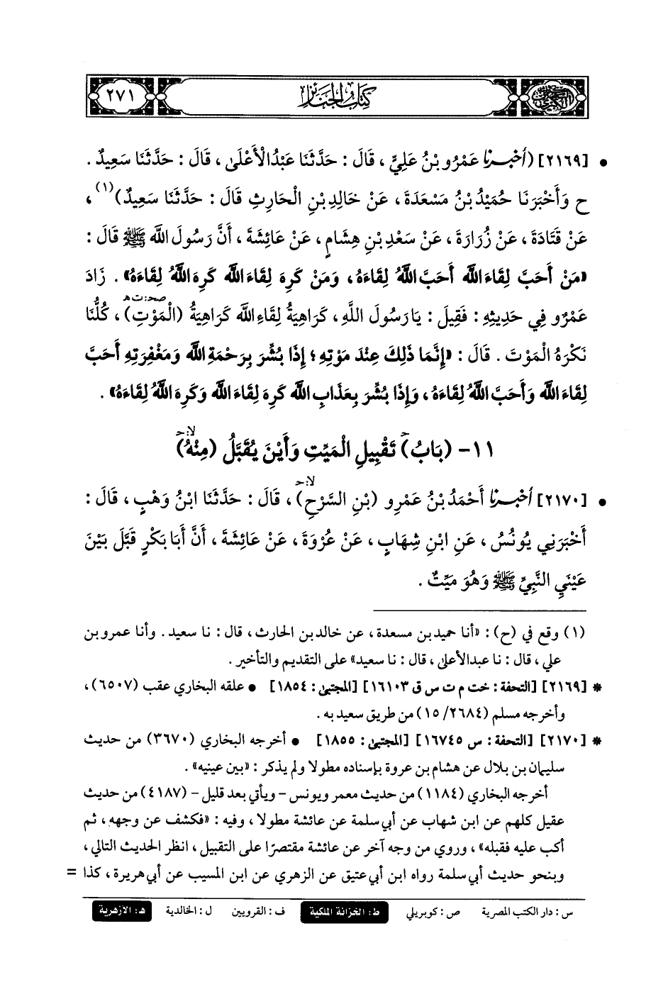 2169- أَخبَرنا عَمرُو بنُ عَلِيٍّ، قَالَ: حَدثنا عَبدُ الأَعْلَى، قَالَ: حَدثنا سَعِيدٌ (ح) وَأَخبَرنا حُمَيْدُ بنُ مَسْعَدَةَ، عَنْ خَالِدِ بْنِ الحَارِثِ، قَالَ: حَدثنا سَعِيدٌ، عَنْ قَتَادَةَ، عَنْ زُرَارَةَ، عَنْ سَعْدِ بْنِ هِشَامٍ، عَنْ عَائِشَةَ، أَنَّ رَسُولَ اللهِ صَلى الله عَليه وسَلم قَالَ: مَنْ أَحَبَّ لِقَاءَ اللهِ أَحَبَّ اللهُ لِقَاءَهُ، وَمَنْ كَرِهَ لِقَاءَ اللهِ كَرِهَ اللهُ لِقَاءَهُ، زَادَ عَمْرٌو فِي حَدِيثِهِ، فَقِيلَ: يَا رَسُولَ اللهِ، كَرَاهِيَةُ لِقَاءِ اللهِ كَرَاهِيَةُ المَوْتِ، كُلُّنَا نَكْرَهُ المَوْتَ؟ قَالَ: إِنَّمَا ذَلِكَ عِنْدَ مَوْتِهِ إِذَا بُشِّرَ بِرَحْمَةِ اللهِ وَمَغْفِرَتِهِ، أَحَبَّ لِقَاءَ اللهِ وَأَحَبَّ اللهُ لِقَاءَهُ، وَإِذَا بُشِّرَ بِعَذَابِ اللهِ كَرِهَ لِقَاءَ اللهِ وَكَرِهَ اللهُ لِقَاءَهُ.