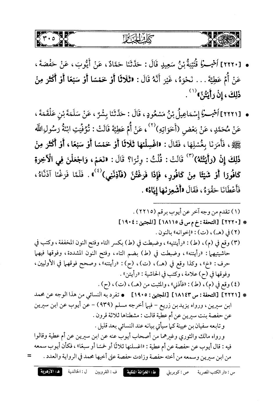 2220- أَخبَرنا قُتَيبَةُ بنُ سَعِيدٍ، قَالَ: حَدثنا حَمَّادٌ، عَنْ أَيُّوبَ، عَنْ حَفْصَةَ، عَنْ أُمِّ عَطِيَّةَ، نَحْوَهُ، غَيْرَ أَنَّهُ قَالَ: ثَلاَثًا أَوْ خَمْسًا أَوْ سَبْعًا أَوْ أَكْثَرَ مِنْ ذَلِكَ، إِنْ رَأَيْتُنَّ.