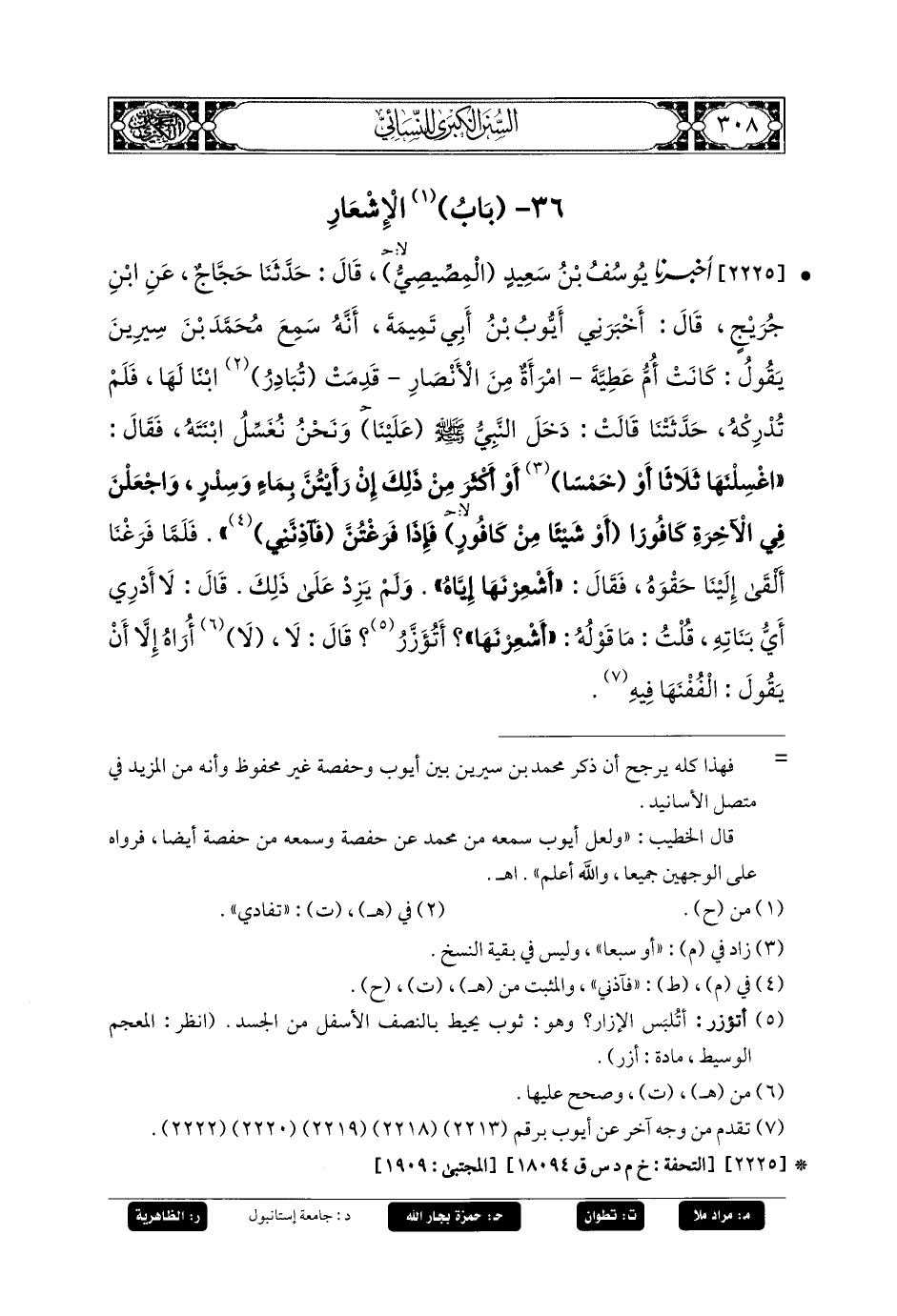 2225- أَخبَرنا يُوسُفُ بنُ سَعِيدٍ المِصِّيصِيُّ، قَالَ: حَدثنا حَجَّاجٌ، عَنِ ابنِ جُرَيْجٍ، قَالَ: أَخبَرني أَيُّوبُ بنُ أَبِي تَمِيمَةَ، أَنَّهُ سَمِعَ مُحَمدَ بْنَ سِيرِينَ يَقُولُ: كَانَتْ أُمُّ عَطِيَّةَ امْرَأَةً مِنَ الأَنْصَارِ قَدِمَتْ تُبَادِرُ ابنًا لَهَا فَلَمْ تُدْرِكْهُ، حَدَّثَتْنَا قَالَتْ: دَخَلَ النَّبِيُّ صَلى الله عَليه وسَلم علينا وَنَحْنُ نَغْسِلُ ابنَتَهُ، فَقَالَ: اغْسِلْنَهَا ثَلاَثًا أَوْ خَمْسًا أَوْ أَكْثَرَ مِنْ ذَلِكَ، إِنْ رَأَيْتُنَّ بِمَاءٍ وَسِدْرٍ، وَاجْعَلْنَ فِي الآخِرَةِ كَافُورًا أَوْ شَيْئًا مِنْ كَافُورٍ فَإِذَا فَرَغْتُنَّ فَآذِنَّنِي، فَلَمَّا فَرَغْنَا أَلْقَى إِلَيْنَا حَقْوَهُ، فَقَالَ: أَشْعِرْنَهَا إِيَّاهُ، وَلَمْ يَزِدْ عَلَى ذَلِكَ، قَالَ: لاَ أَدْرِي أَيُّ بَنَاتِهِ، قُلْتُ: مَا قَوْلُهُ أَشْعِرْنَهَا أَتُؤَزَّرُ؟ قَالَ: لاَ إُرَاهُ إِلاَّ أَنْ يَقُولَ: الفُفْنَهَا فِيهِ.