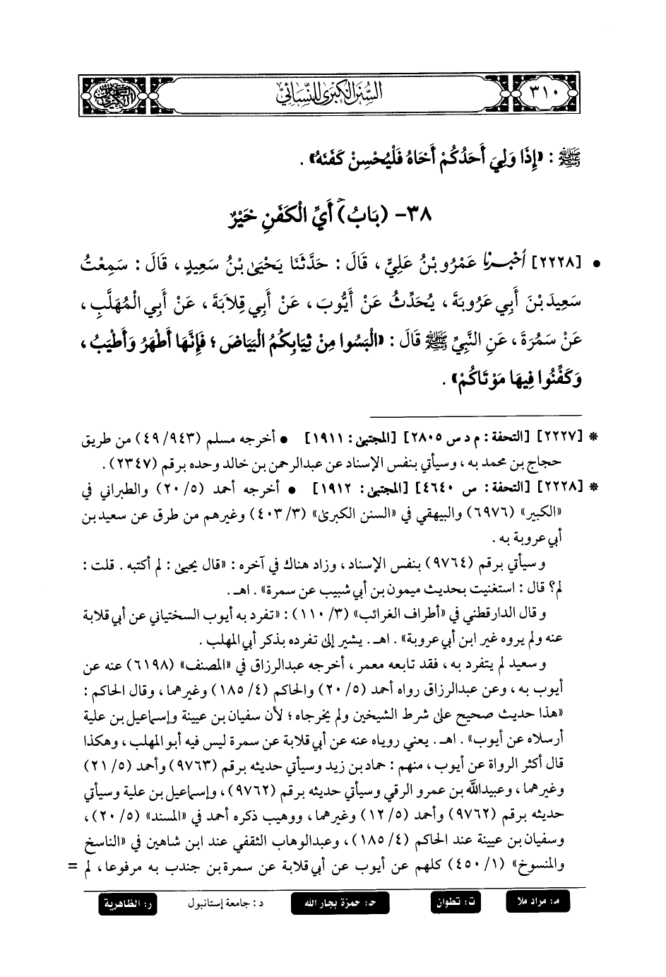2228- أَخبَرنا عَمرُو بنُ عَلِيٍّ، قَالَ: حَدثنا يَحيَى بنُ سَعِيدٍ، قَالَ: سَمِعْتُ سَعِيدَ بْنَ أَبِي عَرُوبَةَ يُحَدِّثُ عَنْ أَيُّوبَ، عَنْ أَبِي قِلاَبَةَ، عَنْ أَبِي المُهَلَّبِ، عَنْ سَمُرَةَ، عَنِ النَّبِيِّ صَلى الله عَليه وسَلم قَالَ: البَسُوا مِنْ ثِيَابِكُمُ البَيَاضَ فَإِنَّهَا أَطْهَرُ وَأَطْيَبُ وَكَفِّنُوا فِيهَا مَوْتَاكُمْ.