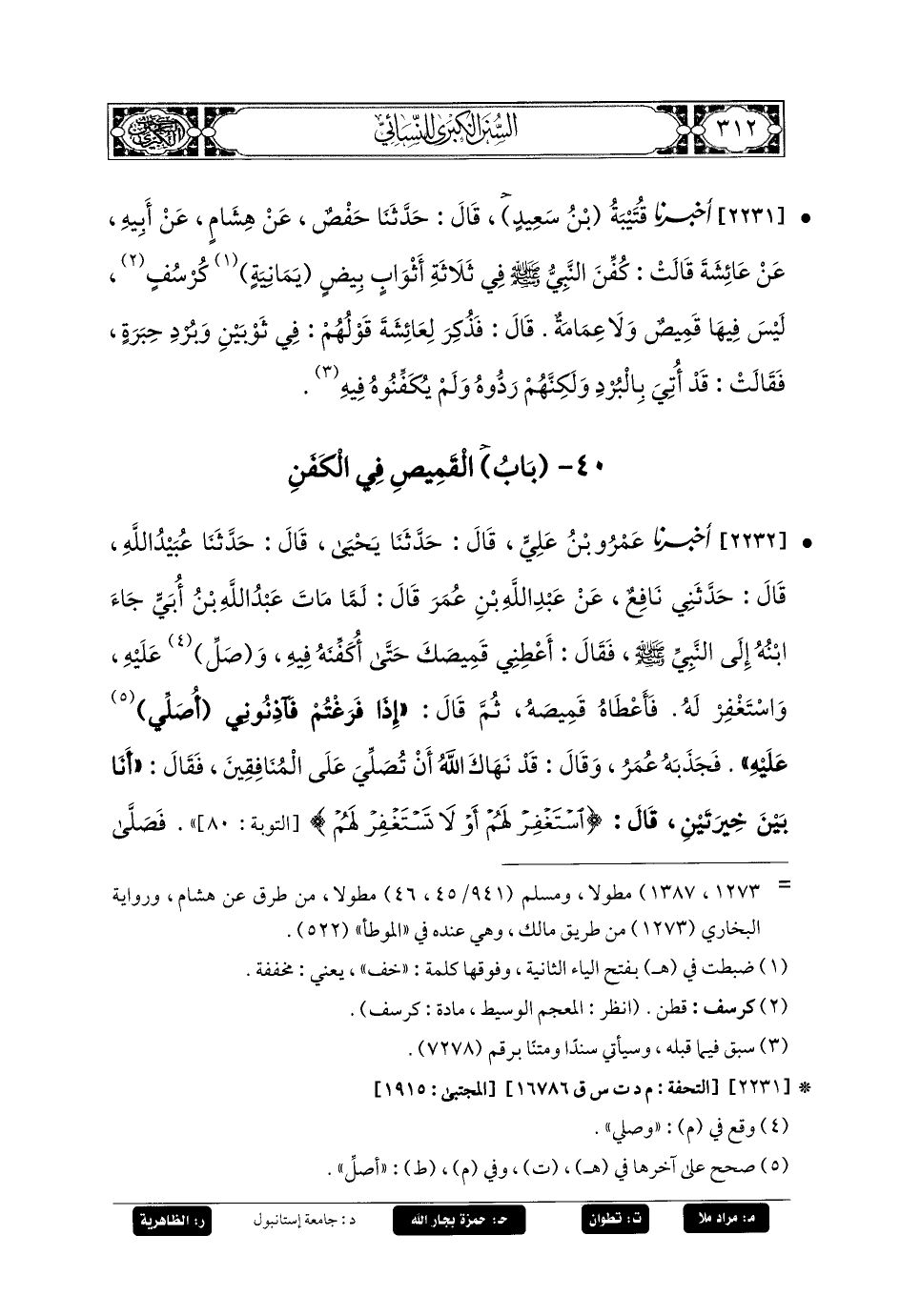 2231- أَخبَرنا قُتَيبَةُ بن سعيد، قَالَ حَدثنا حَفْصٌ، عَنْ هِشَامٍ، عَنْ أَبِيهِ، عَنْ عَائِشَةَ قَالَتْ: كُفِّنَ النَّبِيُّ صَلى الله عَليه وسَلم فِي ثَلاَثَةِ أَثْوَابٍ بِيضٍ يَمَانِيَةٍ كُرْسُفٍ لَيْسَ فِيهَا قَمِيصٌ وَلاَ عِمَامَةٌ، قَالَ: فَذُكِرَ لِعَائِشَةَ قَوْلُهُمْ فِي ثَوْبَيْنِ وَبُرْدٍ حِبَرَةٍ، فقَالَتْ: قَدْ أُتِيَ بِالبُرْدِ وَلَكِنَّهُمْ رَدُّوهُ وَلَمْ يُكَفِّنُوهُ فِيهِ.