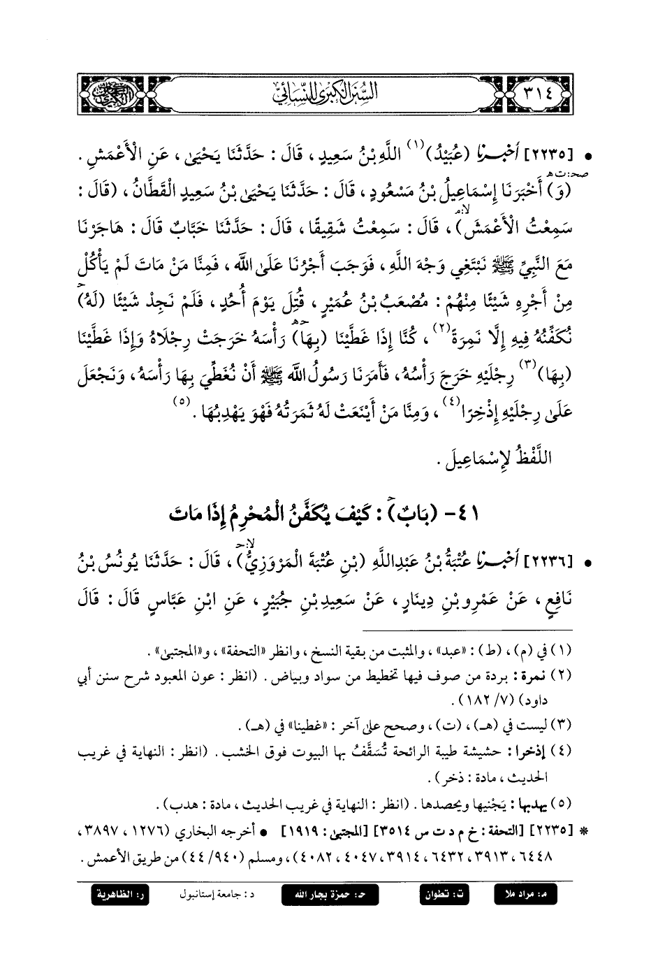 2235- أَخبَرنا عُبَيدُ اللهِ بنُ سَعِيدٍ، قَالَ: حَدثنا يَحيَى، عَنِ الأَعْمَشِ (ح) وَأَخبَرنا إِسْمَاعِيلُ بنُ مَسْعُودٍ، قَالَ: حَدثنا يَحيَى بنُ سَعِيدٍ القَطَّانُ، قَالَ: سَمِعْتُ الأَعْمَشَ، قَالَ: سَمِعْتُ شَقِيقًا، قَالَ: حَدثنا خَبَّابٌ، قَالَ: هَاجَرْنَا مَعَ النَّبِيِّ صَلى الله عَليه وسَلم نَبْتَغِي وَجْهَ اللهِ، فَوَجَبَ أَجْرُنَا عَلَى اللهِ، فَمِنَّا مَنْ مَاتَ لَمْ يَأْكُلْ مِنْ أَجْرِهِ شَيْئًا، مِنْهُمْ مُصْعَبُ بنُ عُمَيْرٍ قُتِلَ يَوْمَ أُحُدٍ، فَلَمْ نَجِدْ شَيْئًا له نُكَفِّنُهُ فِيهِ إِلاَّ نَمِرَةً كُنَّا إِذَا غَطَّيْنَا بها رَأْسَهُ خَرَجَتْ رِجْلاَهُ، وَإِذَا غَطَّيْنَا بِهَا رِجْلَيْهِ خَرَجَ رَأْسُهُ، فَأَمَرَنَا رَسُولُ اللهِ صَلى الله عَليه وسَلم أَنْ نُغَطِّيَ بِهَا رَأْسَهُ، وَنَجْعَلُ عَلَى رِجْلَيْهِ إِذْخِرًا، وَمِنَّا مَنْ أَيْنَعَتْ لَهُ ثَمَرَتُهُ فَهُوَ يَهْدِبُهَا.