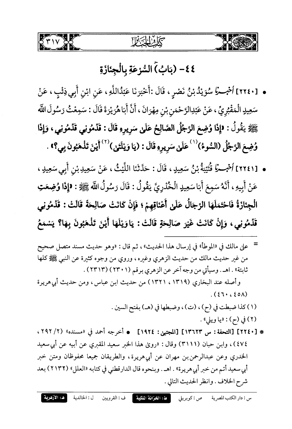 2241- أَخبَرنا قُتَيبَةُ بنُ سَعِيدٍ، قَالَ: حَدثنا اللَّيْثُ، عَنْ سَعِيدِ بْنِ أَبِي سَعِيدٍ، عَنْ أَبِيهِ، أَنَّهُ سَمِعَ أَبَا سَعِيدٍ الخُدْرِيَّ يَقُولُ: قَالَ رَسُولُ اللهِ صَلى الله عَليه وسَلم: إِذَا وُضِعَتِ الجِنَازَةُ فَاحْتَمَلَهَا الرِّجَالُ عَلَى أَعْنَاقِهِمْ، فَإِنْ كَانَتْ صَالِحَةً قَالَتْ: قَدِّمُونِي قَدِّمُونِي، وَإِنْ كَانَتْ غَيْرَ صَالِحَةٍ قَالَتْ: يَا وَيْلَهَا أَيْنَ تَذْهَبُونَ بِهَا، يَسْمَعُ صَوْتَهَا كُلُّ، َشيْءٍ إِلاَّ الإِنْسَانَ وَلَوْ سَمِعَهَا إِنْسَانٌ لَصَعِقَ.