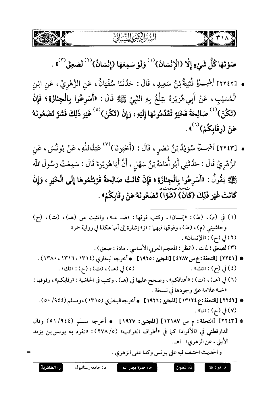2243- أَخبَرنا سُوَيْدُ بنُ نَصْرٍ، قَالَ: أَخبَرنا عَبدُ اللهِ، عَنْ يُونُسَ، عَنِ الزُّهْرِيِّ قَالَ: حَدَّثَنِي أَبُو أُمَامَةَ بنُ سَهْلٍ، أَنَّ أَبَا هُرَيرَةَ، قَالَ: سَمِعْتُ رَسُولَ اللهِ صَلى الله عَليه وسَلم يَقُولُ: أَسْرِعُوا بِالجِنَازَةِ، فَإِنْ كَانَتْ صَالِحَةً قَرَّبْتُمُوهَا إِلَى الخَيْرٍ، وَإِنْ كَانَتْ غَيْرَ ذَلِكَ كَانَ شَرًّا تَضَعُونَهُ عَنْ رِقَابِكُمْ.
