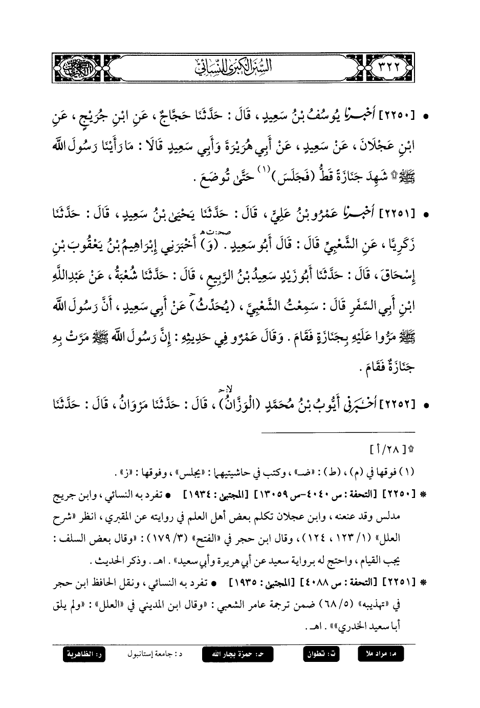 2251- أَخبَرنا عَمرُو بنُ عَلِيٍّ، قَالَ: حَدثنا يَحيَى بنُ سَعِيدٍ، قَالَ: حَدثنا زَكَرِيَّا، عَنِ الشَّعْبِيِّ قَالَ: قَالَ أَبُو سَعِيدٍ: وَأَخبَرني إِبرَاهِيمُ بنُ يَعقُوبَ بْنِ إِسْحَاقَ، قَالَ: حَدثنا أَبُو زَيْدٍ سَعِيدُ بنُ الرَّبِيعِ، قَالَ: حَدثنا شُعبَةُ، عَنْ عَبدِ اللهِ بْنِ أَبِي السَّفَرِ، قَالَ: سَمِعْتُ الشَّعْبِيَّ، يحدث عَنْ أَبِي سَعِيدٍ: أَنَّ رَسُولَ اللهِ صَلى الله عَليه وسَلم مَرُّوا عَلَيْهِ بِجِنَازَةٍ، فَقَامَ، وَقَالَ عَمْرٌو فِي حَدِيثِهِ: إِنَّ رَسُولَ اللهِ صَلى الله عَليه وسَلم مرَّتْ بِهِ جِنَازَةٌ فَقَامَ.