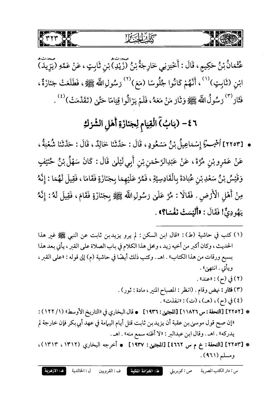 2253- أَخبَرنا إِسْمَاعِيلُ بنُ مَسْعُودٍ، قَالَ: حَدثنا خَالِدٌ، قَالَ: حَدثنا شُعبَةُ، عَنْ عَمْرِو بْنِ مُرَّةَ، عَنْ عَبدِ الرَّحْمَنِ بْنِ أَبِي لَيْلَى قَالَ: كَانَ سَهْلُ بنُ حُنَيْفٍ، وَقَيْسُ بنُ سَعْدِ بْنِ عُبَادَةَ بِالقَادِسِيَّةِ، فَمُرَّ عَلَيْهِمَا بِجِنَازَةٍ، فَقَامَا، فَقِيلَ لَهُمَا: إِنَّهُ مِنْ أَهْلِ الأَرْضِ، فَقَالاَ: مُرَّ عَلَى رَسُولِ اللهِ صَلى الله عَليه وسَلم بِجِنَازَةٍ فَقَامَ، فَقِيلَ لَهُ: إِنَّهُ يَهُودِيٌّ، فَقَالَ: أَلَيْسَتْ نَفْسًا.