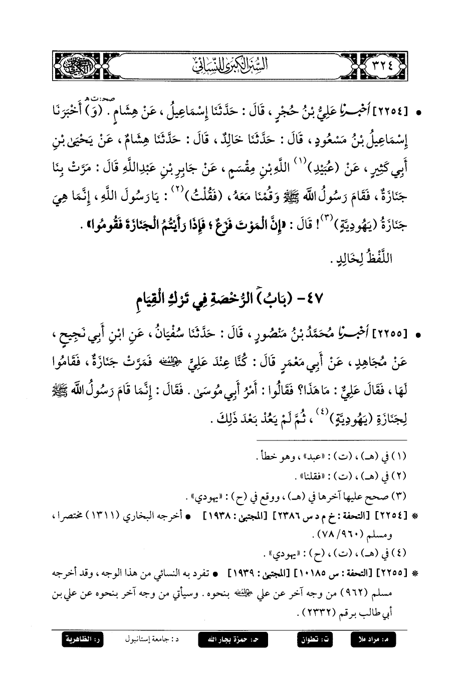 2255- أَخبَرنا مُحَمدُ بنُ مَنصُورٍ، قَالَ: حَدثنا سُفْيَانُ، عَنِ ابنِ أَبِي نَجِيحٍ، عَنْ مُجَاهِدٍ، عَنْ أَبِي مَعْمَرٍ قَالَ: كُنَّا عِنْدَ عَلِيٍّ رضي الله عنه فَمَرَّتْ جِنَازَةٌ، فَقَامُوا لَهَا، فَقَالَ عَلِيٌّ: مَا هَذا؟ فقَالُوا: أَمْرُ أَبِي مُوسَى، فَقَالَ: إِنَّمَا قَامَ رَسُولُ اللهِ صَلى الله عَليه وسَلم لِجِنَازَةِ يَهُودِيَّةٍ، ثُمَّ لَمْ يَعُدْ بَعْدَ ذَلِكَ.