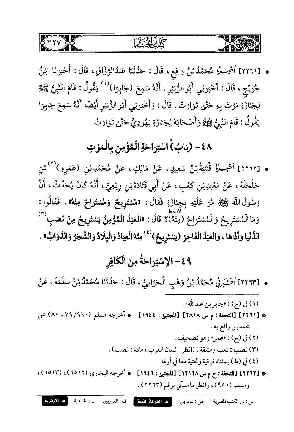 2263- أَخبَرني مُحَمدُ بنُ وَهْبٍ الحَرَّانِيُّ، قَالَ: حَدثنا مُحَمدُ بنُ سَلَمَةَ، عَنْ أَبِي عَبدِ الرَّحِيمِ، قَالَ: حَدَّثَنِي زَيْدٌ، وَهُوَ ابنُ أَبِي أُنَيْسَةَ، عَنْ وَهْبِ بْنِ كَيْسَانَ، عَنْ مَعْبَدِ بْنِ كَعْبٍ، عَنْ أَبِي قَتَادَةَ، قَالَ: كُنَّا جُلُوسًا عِنْدَ رَسُولِ اللهِ صَلى الله عَليه وسَلم، إِذْ طَلَعَتْ جِنَازَةٌ، فَقَالَ رَسُولُ اللهِ صَلى الله عَليه وسَلم: مُسْتَرِيحٌ وَمُسْتَرَاحٌ مِنْهُ، المُؤْمِنُ يَمُوتُ فَيَسْتَرِيحُ مِنْ أَوْصَابِ الدُّنْيَا وَنَصَبِهَا وَأَذَاهَا، وَالفَاجِرُ يَمُوتُ فَيَسْتَرِيحُ العِبَادُ وَالبِلاَدُ وَالدَّوَابُّ وَالشَّجَرُ مِنْهُ.