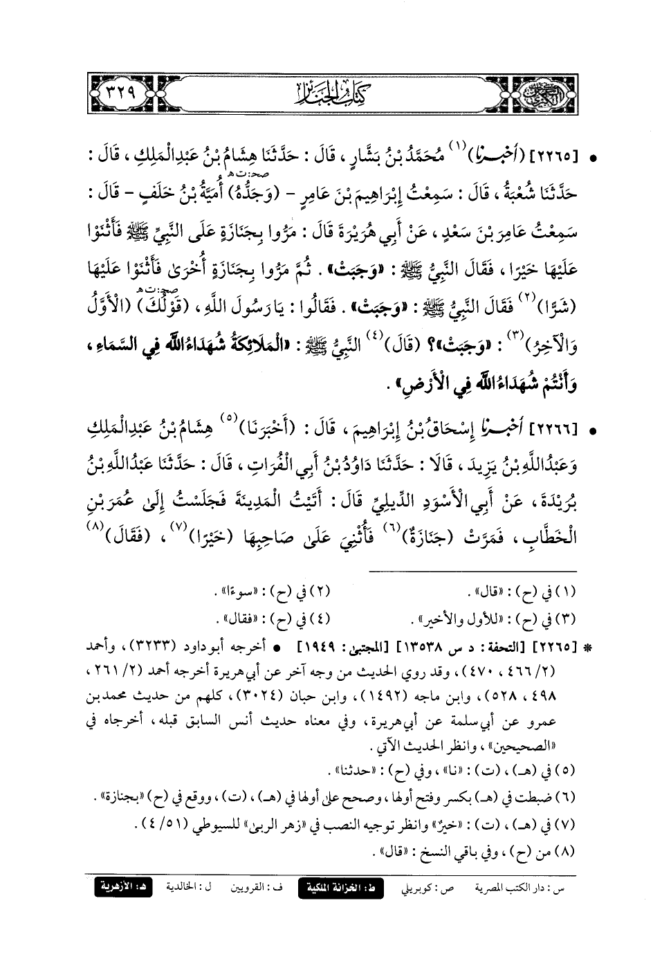 2265- أَخبَرنا مُحَمدُ بنُ بَشَّارٍ، قَالَ: حَدثنا هِشَامُ بنُ عَبدِ المَلِكِ، قَالَ: حَدثنا شُعبَةُ، قَالَ: سَمِعْتُ إِبرَاهِيمَ بْنَ عَامِرٍ، وَجَدُّهُ أُمَيَّةَ بْنَ خَلَفٍ، قَالَ: سَمِعْتُ عَامِرَ بْنَ سَعْدٍ، عَنْ أَبِي هُرَيرَةَ قَالَ: مَرُّوا بِجِنَازَةٍ عَلَى النَّبِيِّ صَلى الله عَليه وسَلم، فَأَثْنَوْا عَلَيْهَا خَيْرًا، فَقَالَ النَّبِيُّ صَلى الله عَليه وسَلم: وَجَبَتْ، ثُمَّ مَرُّوا بِجِنَازَةٍ أُخْرَى، فَأَثْنَوْا عَلَيْهَا شَرًّا، فَقَالَ النَّبِيُّ صَلى الله عَليه وسَلم: وَجَبَتْ، فَقَالُوا: يَا رَسُولَ اللهِ، قَوْلُكَ الأَوَّلُ وَالآخِرُ وَجَبَتْ، قَالَ النَّبِيُّ صَلى الله عَليه وسَلم: المَلاَئِكَةُ شُهَدَاءُ اللهِ فِي السَّمَاءِ، وَأَنْتُمْ شُهَدَاءُ اللهِ فِي الأَرْضِ.