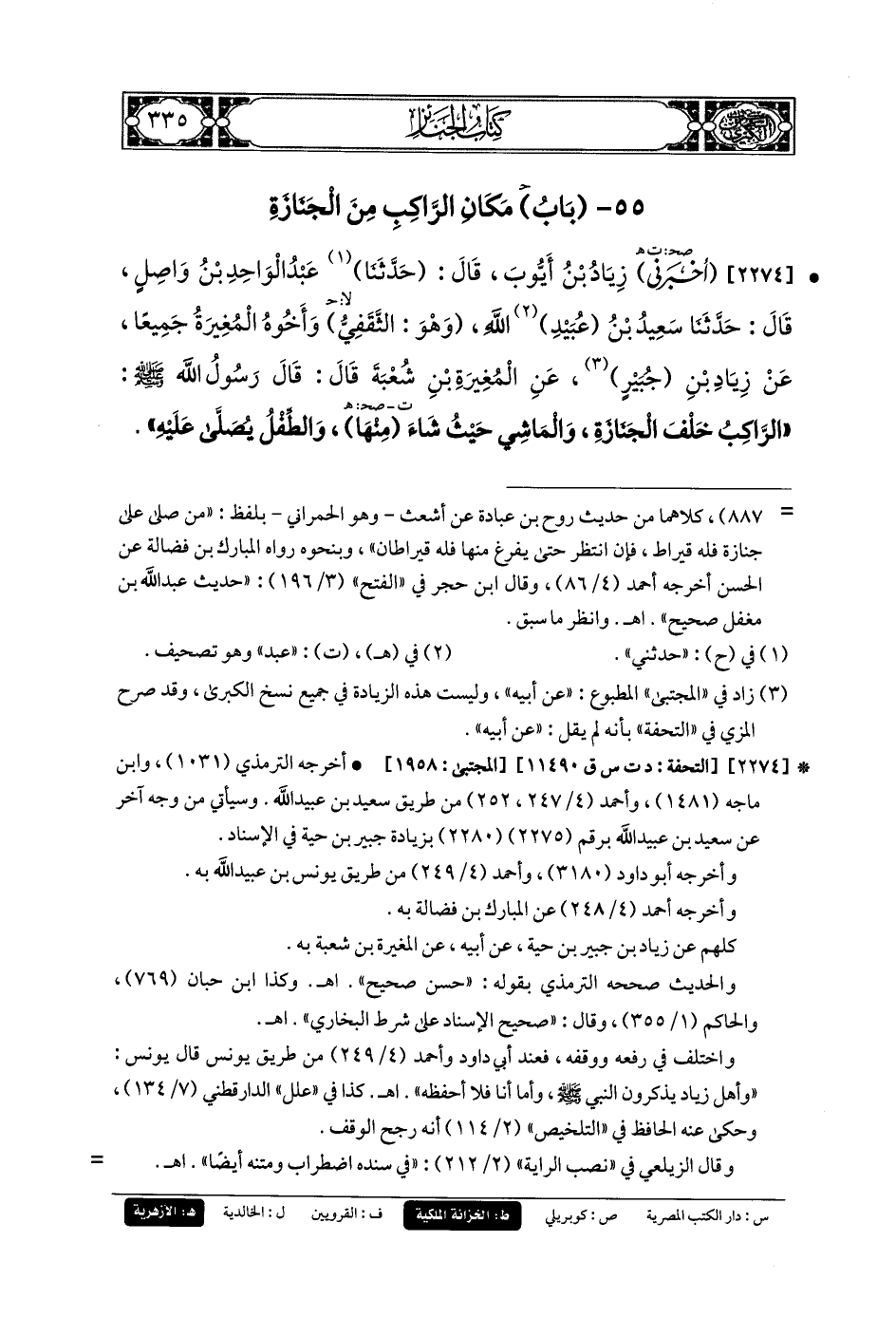 2274- أَخبَرني زِيَادُ بنُ أَيُّوبَ، قَالَ: حَدثنا عَبدُ الوَاحِدِ بنُ وَاصِلٍ، قَالَ: حَدثنا سَعِيدُ بنُ عُبَيدِ اللهِ، وَهُوَ الثَّقَفِيُّ، وَأَخُوهُ المُغِيرَةُ جَمِيعًا عَنْ زِيَادِ بْنِ جُبَيرٍ، عَنِ المُغِيرَةِ بْنِ شُعبَةَ قَالَ: قَالَ رَسُولُ اللهِ صَلى الله عَليه وسَلم: الرَّاكِبُ خَلْفَ الجِنَازَةِ، وَالمَاشِي حَيْثُ شَاءَ مِنْهَا، وَالطِّفْلُ يُصَلَّى عَلَيْهِ.