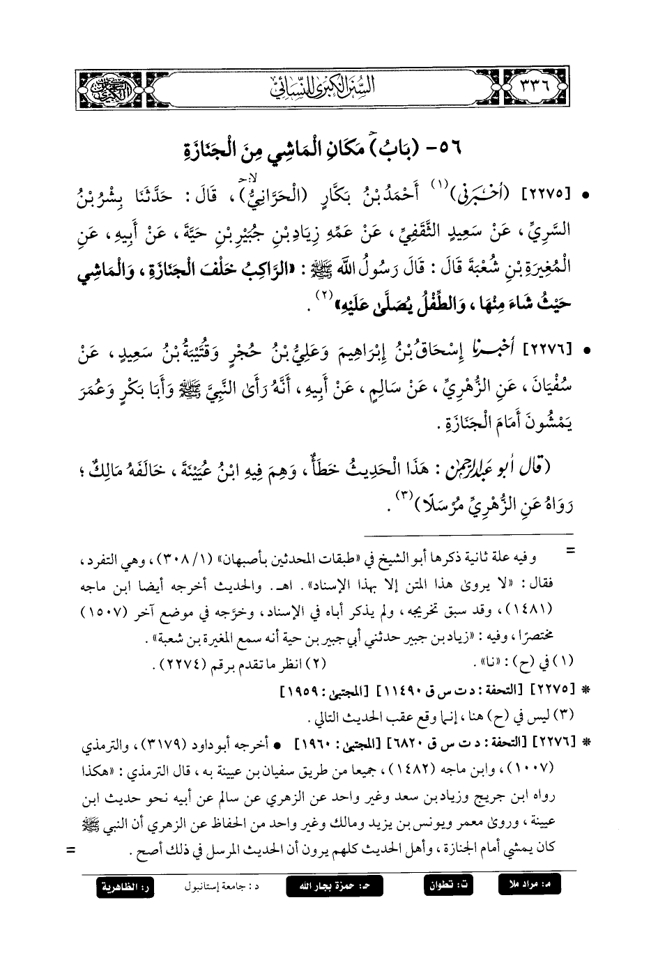 2275- أَخبَرني أَحْمَدُ بنُ بَكَّارٍ الحَرَّانِيُّ، قَالَ: حَدثنا بِشْرُ بنُ السَّرِيِّ، عَنْ سَعِيدٍ الثَّقَفِيِّ، عَنْ عَمِّهِ زِيَادِ بْنِ جُبَيرِ بْنِ حَيَّةَ، عَنْ أَبِيهِ، عَنِ المُغِيرَةِ بْنِ شُعبَةَ قَالَ: قَالَ رَسُولُ اللهِ صَلى الله عَليه وسَلم: الرَّاكِبُ خَلْفَ الجِنَازَةِ، وَالمَاشِي حَيْثُ شَاءَ مِنْهَا، وَالطِّفْلُ يُصَلَّى عَلَيْهِ.