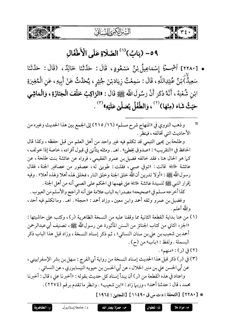 2280- أَخبَرنا إِسْمَاعِيلُ بنُ مَسْعُودٍ، قَالَ: حَدثنا خَالِدٌ، قَالَ: حَدثنا سَعِيدُ بنُ عُبَيدِ اللهِ، قَالَ: سَمِعْتُ زِيَادَ بْنَ جُبَيرٍ يُحَدِّثُ عَنْ أَبِيهِ، عَنِ المُغِيرَةِ بْنِ شُعبَةَ، أَنَّهُ ذَكَرَ أَنَّ رَسُولَ اللهِ صَلى الله عَليه وسَلم قَالَ: الرَّاكِبُ خَلْفَ الجِنَازَةِ، وَالمَاشِي حَيْثُ شَاءَ مِنْهَا، وَالطِّفْلُ يُصَلَّى عَلَيْهِ.