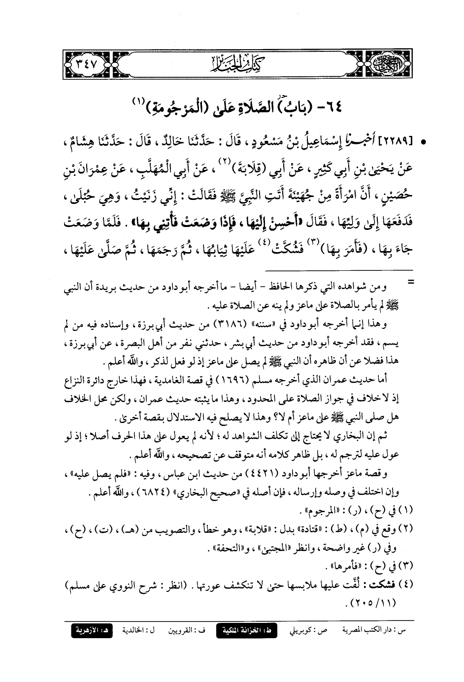 2289- أَخبَرنا إِسْمَاعِيلُ بنُ مَسْعُودٍ، قَالَ: حَدثنا خَالِدٌ، قَالَ: حَدثنا هِشَامٌ، عَنْ يَحيَى بْنِ أَبِي كَثِيرٍ، عَنْ أَبِي قِلاَبَةَ، عَنْ أَبِي المُهَلَّبِ، عَنْ عِمْرَانَ بْنِ حُصَيْنٍ، أَنَّ امْرَأَةً مِنْ جُهَيْنَةَ أَتَتِ النَّبِيَّ صَلى الله عَليه وسَلم فَقَالَتْ: إِنِّي زَنَيْتُ، وَهِيَ حُبْلَى، فَدَفَعَهَا إِلَى وَلِيِّهَا، فَقَالَ: أَحْسِنْ إِلَيْهَا، فَإِذَا وَضَعَتْ فَأْتِنِي بِهَا، فَلَمَّا وَضَعَتْ جَاءَ بِهَا، فَأَمَرَ بِهَا فَشُكَّتْ عَلَيْهَا ثِيَابُهَا، ثُمَّ رَجَمَهَا، ثُمَّ صَلَّى عَلَيْهَا، فَقَالَ لَهُ عُمَرُ: تُصَلِّي عَلَيْهَا وَقَدْ زَنَتْ؟ قَالَ: لَقَدْ تَابَتْ تَوْبَةً لَوْ قُسِمَتْ بَيْنَ سَبْعِينَ مِنْ أَهْلِ المَدِينَةِ لَوَسِعَتْهُمْ، وَهَلْ وَجَدْتَ أَفْضَلُ مِنْ أَنْ جَادَتْ بِنَفْسِهَا لِلَّهِ عز وجل.