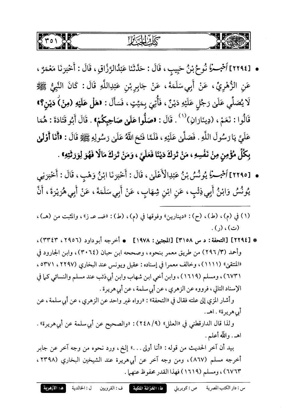 2294- أَخبَرنا نُوحُ بنُ حَبِيبٍ، قَالَ: حَدثنا عَبدُ الرَّزَّاقِ، قَالَ: أَخبَرنا مَعْمَرٌ، عَنِ الزُّهْرِيِّ، عَنْ أَبِي سَلَمَةَ، عَنْ جَابِرِ بْنِ عَبدِ اللهِ قَالَ: كَانَ النَّبِيُّ صَلى الله عَليه وسَلم لاَ يُصَلِّي عَلَى رَجُلٍ عَلَيْهِ دَيْنٌ، فَأُتِيَ بِمَيِّتٍ فَسَأَلَ هَلْ عَلَيْهِ من دَيْنٌ؟ قَالُوا: نَعَمْ دِينَارَانِ، قَالَ: صَلُّوا عَلَى صَاحِبِكُمْ، قَالَ أَبُو قَتَادَةَ: هُمَا عَلَيَّ يَا رَسُولَ اللهِ، فَصَلَّى عَلَيْهِ، فَلَمَّا فَتَحَ اللهُ عَلَى رَسُولِهِ صَلى الله عَليه وسَلم قَالَ: أَنَا أَوْلَى بِكُلِّ مُؤْمِنٍ مِنْ نَفْسِهِ، مَنْ تَرَكَ دَيْنًا فَعَلَيَّ، وَمَنْ تَرَكَ مَالاً فَهُوَ لِوَرَثَتِهِ.