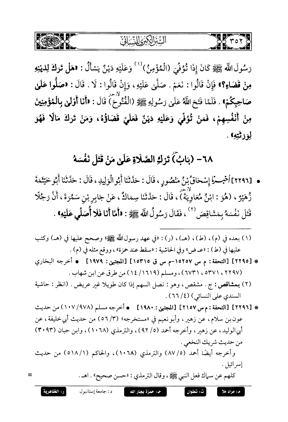 2296- أَخبَرنا إِسْحَاقُ بنُ مَنصُورٍ، قَالَ: حَدثنا أَبُو الوَلِيدِ، قَالَ: حَدثنا أَبُو خَيْثَمَةَ زُهَيْرُ، هُوَ ابنُ مُعَاوِيَةَ، قَالَ: حَدثنا سِمَاكٌ، عَنْ جَابِرِ بْنِ سَمُرَةَ، أَنَّ رَجُلاً قَتَلَ نَفْسَهُ بِمَشَاقِصَ، فَقَالَ رَسُولُ اللهِ صَلى الله عَليه وسَلم: أَمَّا أَنَا فَلاَ أُصَلِّي عَلَيْهِ.
