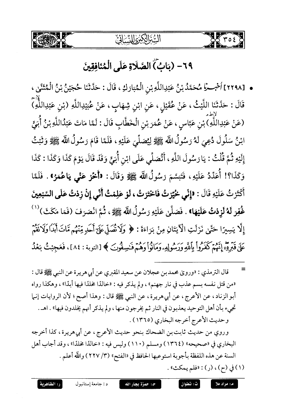 2298- أَخبَرنا مُحَمدُ بنُ عَبدِ اللهِ بْنِ المُبَارَكِ، قَالَ: حَدثنا حُجَيْنُ بنُ المُثَنَّى، قَالَ: حَدثنا اللَّيْثُ، عَنْ عُقَيْلٍ، عَنِ ابنِ شِهَابٍ، عَنْ عُبَيدِ اللهِ بْنِ عَبدِ اللهِ، عَنْ عَبدِ اللهِ بْنِ عَبَّاسٍ، عَنْ عُمَرَ بْنِ الخَطَّابِ قَالَ: لَمَّا مَاتَ عَبدُ اللهِ بنُ أُبَيِّ ابنِ سَلُولٍ، دُعِيَ لَهُ رَسُولُ اللهِ صَلى الله عَليه وسَلم لِيُصَلِّيَ عَلَيْهِ، فَلَمَّا قَامَ رَسُولُ اللهِ صَلى الله عَليه وسَلم وَثَبْتُ إِلَيْهِ، ثُمَّ قُلْتُ: يَا رَسُولَ اللهِ، أَتُصَلِّي عَلَى ابنِ أُبَيٍّ، وَقَدْ قَالَ يَوْمَ كَذَا وَكَذَا كَذَا وَكَذَا، أُعَدِّدُ عَلَيْهِ، فَتَبَسَّمَ رَسُولُ اللهِ صَلى الله عَليه وسَلم وَقَالَ: أَخِّرْ عَنِّي يَا عُمَرُ، فَلَمَّا أَكْثَرْتُ عَلَيْهِ قَالَ: إِنِّي خُيِّرْتُ فَاخْتَرْتُ لَوْ عَلِمْتُ أَنِّي إِنْ زِدْتُ عَلَى السَّبْعِينَ غُفِرَ لَهُ لَزِدْتُ عَلَيْهَا، فَصَلَّى عَلَيْهِ رَسُولُ اللهِ صَلى الله عَليه وسَلم، ثُمَّ انْصَرَفَ، فَمَا مَكَثَ إِلاَّ يَسِيرًا حَتَّى نَزَلَتِ الآيَتَانِ مِنْ بَرَاءَةَ: {وَلاَ تُصَلِّ عَلَى أَحَدٍ مِنْهُمْ مَاتَ أَبَدًا وَلاَ تَقُمْ عَلَى قَبْرِهِ إِنَّهُمْ كَفَرُوا بِاللهِ وَرَسُولِهِ وَمَاتُوا وَهُمْ فَاسِقُونَ} فَعَجِبْتُ بَعْدُ مِنْ جُرْأَتِي عَلَى رَسُولِ اللهِ صَلى الله عَليه وسَلم يَوْمَئِذٍ، وَاللهُ وَرَسُولُهُ أَعْلَمُ.