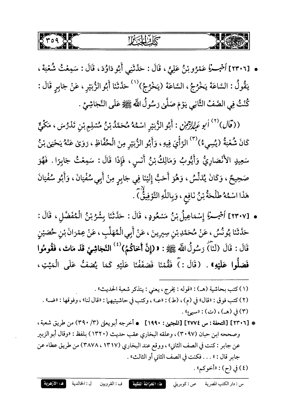 2306- أَخبَرنا عَمرُو بنُ عَلِيٍّ، قَالَ: حَدَّثَنِي أَبُو دَاودَ، قَالَ: سَمِعْتُ شُعبَةَ يَقُولُ: السَّاعَةَ يَخْرُجُ، السَّاعَةَ يَخْرُجُ، حَدثنا أَبُو الزُّبَيْرِ، عَنْ جَابِرٍ قَالَ: كُنْتُ فِي الصَّفِّ الثَّانِي يَوْمَ صَلَّى رَسُولُ اللهِ صَلى الله عَليه وسَلم عَلَى النَّجَاشِيِّ.