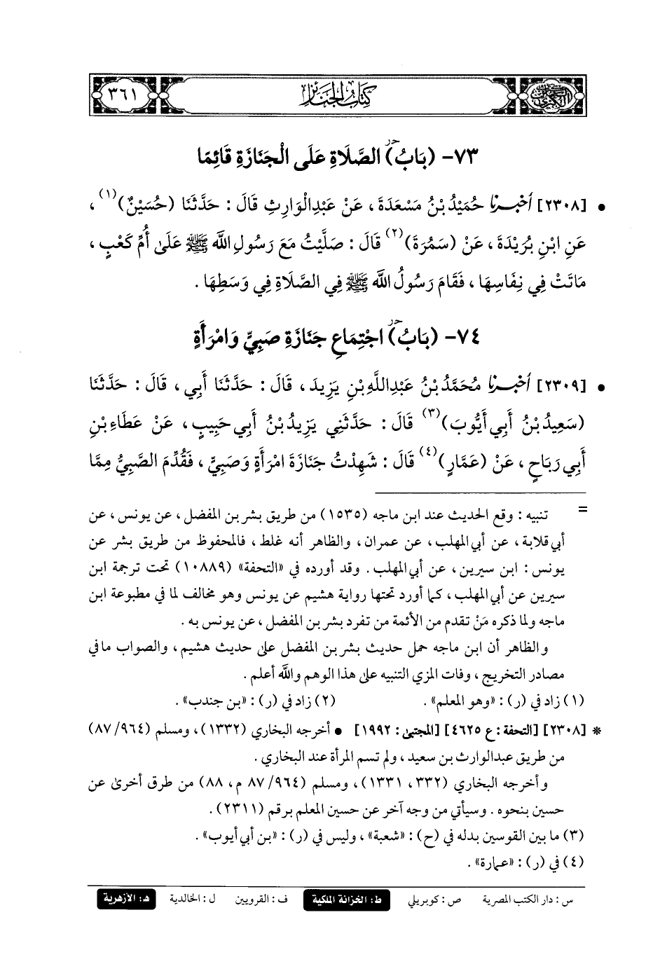 2308- أَخبَرنا حُمَيْدُ بنُ مَسْعَدَةَ، عَنْ عَبدِ الوَارِثِ، قَالَ: حَدثنا حُسَيْنٌ، عَنِ ابنِ بُرَيْدَةَ، عَنْ سَمُرَةَ قَالَ: صَلَّيْتُ مَعَ رَسُولِ اللهِ صَلى الله عَليه وسَلم عَلَى أُمِّ كَعْبٍ مَاتَتْ فِي نِفَاسِهَا، فَقَامَ رَسُولُ اللهِ صَلى الله عَليه وسَلم فِي الصَّلاَةِ فِي وَسَطِهَا.