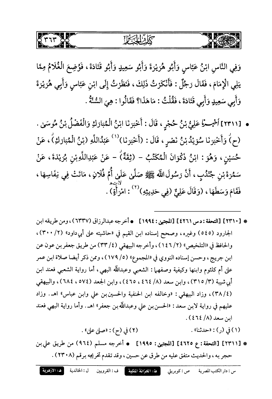 2311- أَخبَرنا عَلِيُّ بنُ حُجْرٍ، قَالَ: حَدثنا ابنُ المُبَارَكِ، وَالفَضْلُ بنُ مُوسَى، (ح) وأَخبَرنا سُوَيْدُ بنُ نَصْرٍ، قَالَ: أَخبَرنا عَبدُ اللهِ بن المبارك، عَنْ حُسَيْنٍ، وَهُوَ ابنُ ذَكْوَانَ المُكْتِبُ، ثِقَةٌ، عَنْ عَبدِ اللهِ بْنِ بُرَيْدَةَ، عَنْ سَمُرَةَ بْنِ جُنْدُبٍ، أَنَّ رَسُولَ اللهِ صَلى الله عَليه وسَلم صَلَّى عَلَى أُمِّ فُلاَنٍ مَاتَتْ فِي نِفَاسِهَا، فَقَامَ وَسَطَهَا.