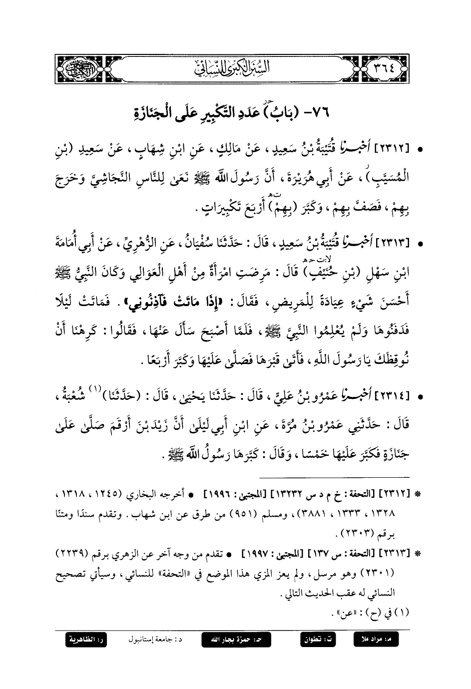 2313- أَخبَرنا قُتَيبَةُ بنُ سَعِيدٍ، قَالَ: حَدثنا سُفْيَانُ، عَنِ الزُّهْرِيِّ، عَنْ أَبِي أُمَامَةَ بْنِ سَهْلِ بْنِ حُنَيْفٍ قَالَ: مَرِضَتِ امْرَأَةٌ مِنْ أَهْلِ العَوَالِي، وَكَانَ النَّبِيُّ صَلى الله عَليه وسَلم أَحْسَنَ شَيْءٍ عِيَادَةً لِلْمَرِيضِ، فَقَالَ: إِذَا مَاتَتْ فَآذِنُونِي، فَمَاتَتْ لَيْلاً فَدَفَنُوهَا وَلَمْ يُعْلِمُوا النَّبِيَّ صَلى الله عَليه وسَلم، فَلَمَّا أَصْبَحَ سَأَلَ عَنْهَا، فَقَالُوا: كَرِهْنَا أَنْ نُوقِظَكَ يَا رَسُولَ اللهِ، فَأَتَى قَبْرَهَا فَصَلَّى عَلَيْهَا وَكَبَّرَ أَرْبَعًا.