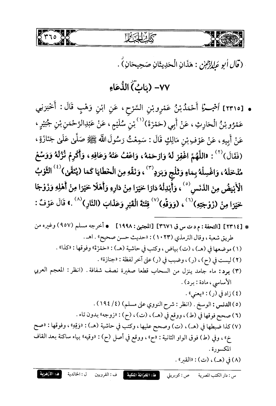 2315- أَخبَرنا أَحْمَدُ بنُ عَمْرِو بْنِ السَّرْحِ، عَنِ ابنِ وَهْبٍ، قَالَ: أَخبَرني عَمرُو بنُ الحَارِثِ، عَنْ أَبِي حَمْزَةَ بْنِ سُلَيْمٍ، عَنْ عَبدِ الرَّحْمَنِ بْنِ جُبَيرٍ، عَنْ أَبِيهِ، عَنْ عَوْفِ بْنِ مَالِكٍ، قَالَ: سَمِعْتُ رَسُولَ اللهِ صَلى الله عَليه وسَلم صَلَّى عَلَى جِنَازَةٍ، فَقَالَ: اللهُمَّ اغْفِرْ لَهُ، وَارْحَمْهُ، وَاعْفُ عَنْهُ، وَعَافِهِ، وَأَكْرِمْ نُزَلَهُ، وَوَسِّعْ مُدْخَلَهُ، وَاغْسِلْهُ بِمَاءٍ وَثَلْجٍ وَبَرَدٍ، وَنَقِّهِ مِنَ الخَطَايَا كَمَا يُنَقَّى الثَّوْبُ الأَبْيَضُ مِنَ الدَّنَسِ، وَأَبْدِلْهُ دَارًا خَيْرًا مِنْ دَارِهِ، وَأَهْلاً خَيْرًا مِنْ أَهْلِهِ، وَزَوْجًا خَيْرًا مِنْ زَوْجِتهِ، وَوَقِّهِ فِتْنَةَ القَبْرِ وَعَذَابَ النَّارِ، قَالَ عَوْفٌ: فَتَمَنَّيْتُ أَنْ لَوْ كُنْتُ المَيِّتَ لِدُعَاءِ رَسُولِ اللهِ صَلى الله عَليه وسَلم لِذَلِكَ المَيِّتِ.