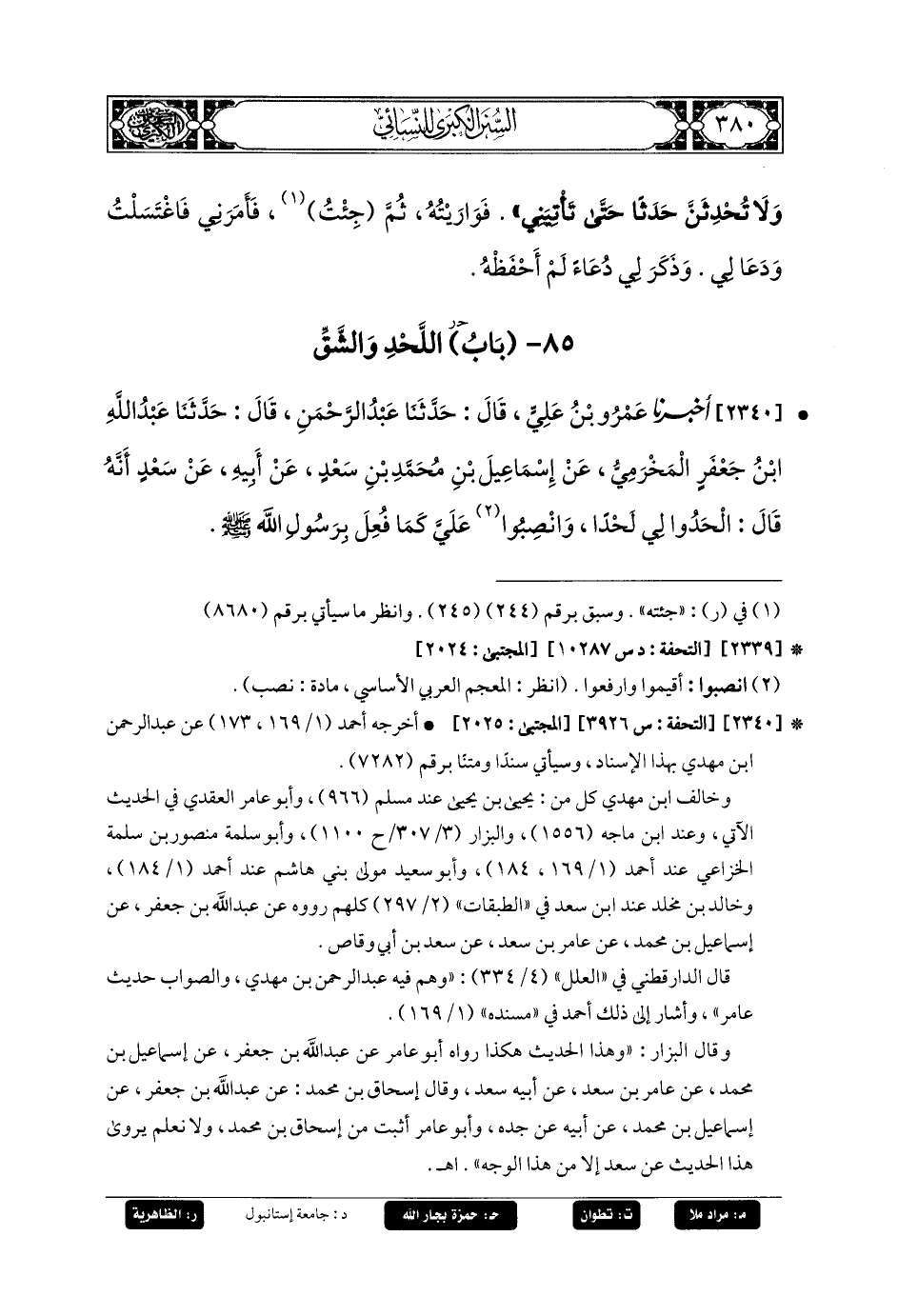 2340- أَخبَرنا عَمرُو بنُ عَلِيٍّ، قَالَ: حَدثنا عَبدُ الرَّحْمَنِ، قَالَ: حَدثنا عَبدُ اللهِ بنُ جَعفَرٍ المَخْرَمِيُّ، عَنْ إِسْمَاعِيلَ بْنِ مُحَمدِ بْنِ سَعْدٍ، عَنْ أَبِيهِ، عَنْ سَعْدٍ، أَنَّهُ قَالَ: الحَدُوا لِي لَحْدًا، وَانْصِبُوا عَلَيَّ كَمَا فُعِلَ بِرَسُولِ اللهِ صَلى الله عَليه وسَلم.