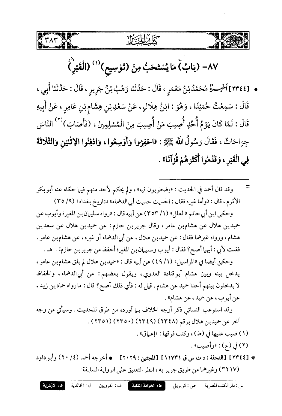 2344- أَخبَرنا مُحَمدُ بنُ مَعْمَرٍ، قَالَ: حَدثنا وَهْبُ بنُ جَرِيرٍ، قَالَ: حَدثنا أَبِي، قَالَ: سَمِعْتُ حُمَيْدًا، وَهُوَ ابنُ هِلاَلٍ، عَنْ سَعْدِ بْنِ هِشَامِ بْنِ عَامِرٍ، عَنْ أَبِيهِ، قَالَ: لَمَّا كَانَ يَوْمُ أُحُدٍ أُصِيبَ مِنَ المُسْلِمِينَ فَأَصَابَ النَّاسُ جِرَاحَاتٍ، فَقَالَ رَسُولُ اللهِ صَلى الله عَليه وسَلم: احْفِرُوا وَأَوْسِعُوا، وَادْفِنُوا الاِثْنَيْنِ فِي القَبْرِ، وَقَدِّمُوا أَكْثَرَهُمْ قُرْآنًا.