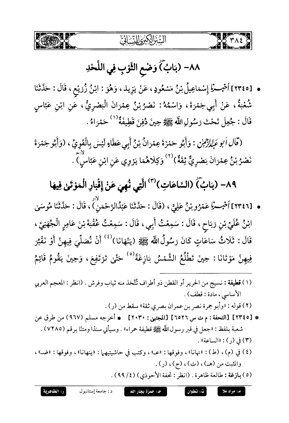 2345- أَخبَرنا إِسْمَاعِيلُ بنُ مَسْعُودٍ، عَنْ يَزِيدَ، وَهُوَ ابنُ زُرَيْعٍ، قَالَ: حَدثنا شُعبَةُ، عَنْ أَبِي جَمْرَةَ، وَاسْمُهُ: نَصْرُ بنُ عِمْرَانَ البَصْرِيُّ، عَنِ ابنِ عَبَّاسٍ قَالَ: جُعِلَ تَحْتَ رَسُولِ اللهِ صَلى الله عَليه وسَلم حِينَ دُفِنَ قَطِيفَةٌ حَمْرَاءُ.