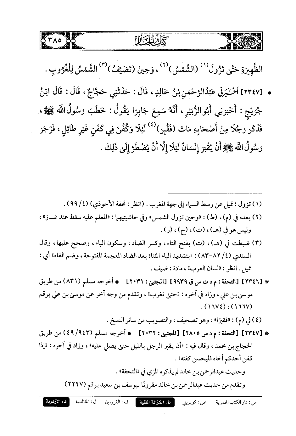 2347- أَخبَرني عَبدُ الرَّحْمَنِ بنُ خَالِدٍ، قَالَ: حَدَّثَنِي حَجَّاجٌ، قَالَ: قَالَ ابنُ جُرَيْجٍ: أَخبَرني أَبُو الزُّبَيْرِ، أَنَّهُ سَمِعَ جَابِرًا يَقُولُ: خَطَبَ رَسُولُ اللهِ صَلى الله عَليه وسَلم فَذَكَرَ رَجُلاً مِنْ أَصْحَابِهِ مَاتَ فَقُبِرَ لَيْلاً وَكُفِّنَ فِي كَفَنٍ غَيْرِ طَائِلٍ، فَزَجَرَ رَسُولُ اللهِ صَلى الله عَليه وسَلم أَنْ يُقْبَرَ إِنْسَانٌ لَيْلاً، إِلاَّ أَنْ يُضْطَرَّ إِلَى ذَلِكَ.