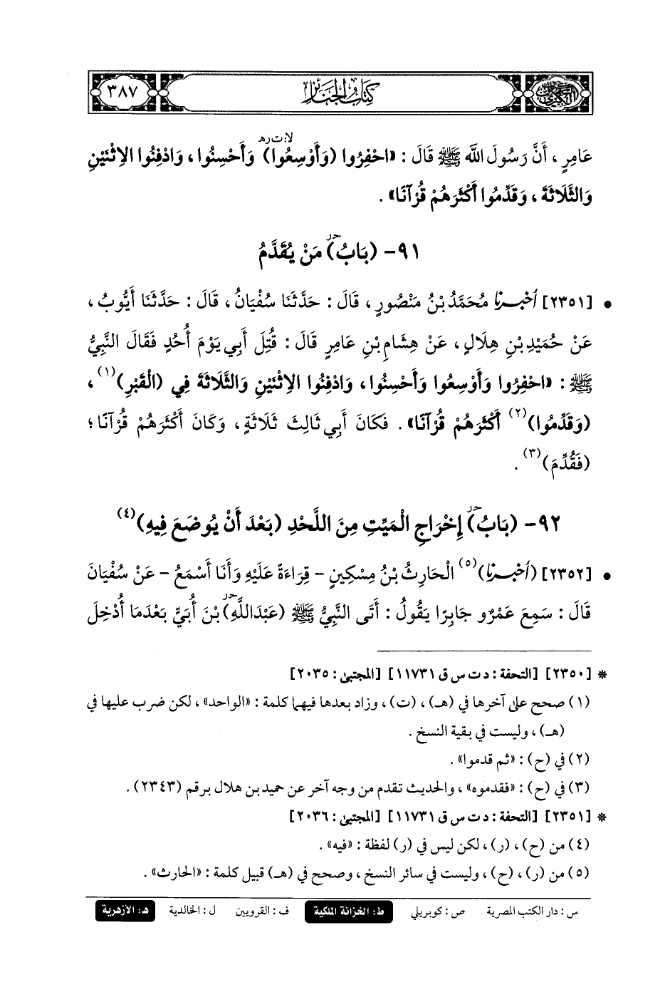 2351- أَخبَرنا مُحَمدُ بنُ مَنصُورٍ، قَالَ: حَدثنا سُفْيَانُ، قَالَ: حَدثنا أَيُّوبُ، عَنْ حُمَيْدِ بْنِ هِلاَلٍ، عَنْ هِشَامِ بْنِ عَامِرٍ قَالَ: قُتِلَ أَبِي يَوْمَ أُحُدٍ، فَقَالَ النَّبِيُّ صَلى الله عَليه وسَلم: احْفِرُوا وَأَوْسِعُوا وَأَحْسِنُوا، وَادْفِنُوا الاِثْنَيْنِ وَالثَّلاَثَةَ فِي القَبْرِ، وَقَدِّمُوا أَكْثَرَهُمْ قُرْآنًا، فَكَانَ أَبِي ثَالِثَ ثَلاَثَةٍ، وَكَانَ أَكْثَرَهُمْ قُرْآنًا، فَقُدِّمَ.