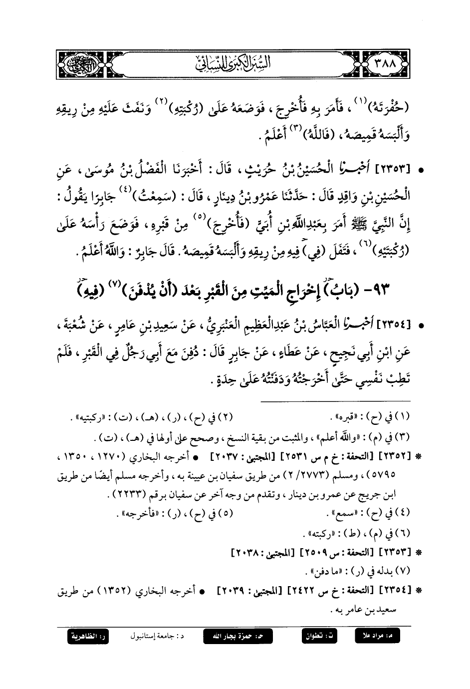 2353- أَخبَرنا الحُسَيْنُ بنُ حُرَيْثٍ، قَالَ: أَخبَرنا الفَضْلُ بنُ مُوسَى، عَنِ الحُسَيْنِ بْنِ وَاقِدٍ، قَالَ: حَدثنا عَمرُو بنُ دِينَارٍ، قَالَ: سَمِعْتُ جَابِرًا يَقُولُ: إِنَّ النَّبِيَّ صَلى الله عَليه وسَلم أَمَرَ بِعَبدِ اللهِ بْنِ أُبَيٍّ، فَأُخْرِجَ مِنْ قَبْرِهِ، فَوَضَعَ رَأْسَهُ عَلَى رُكْبَتَيْهِ، فَتَفَلَ في فِيهِ مِنْ رِيقِهِ، وَأَلْبَسَهُ قَمِيصَهُ، قَالَ جَابِرٌ: وَاللهُ أَعْلَمُ.