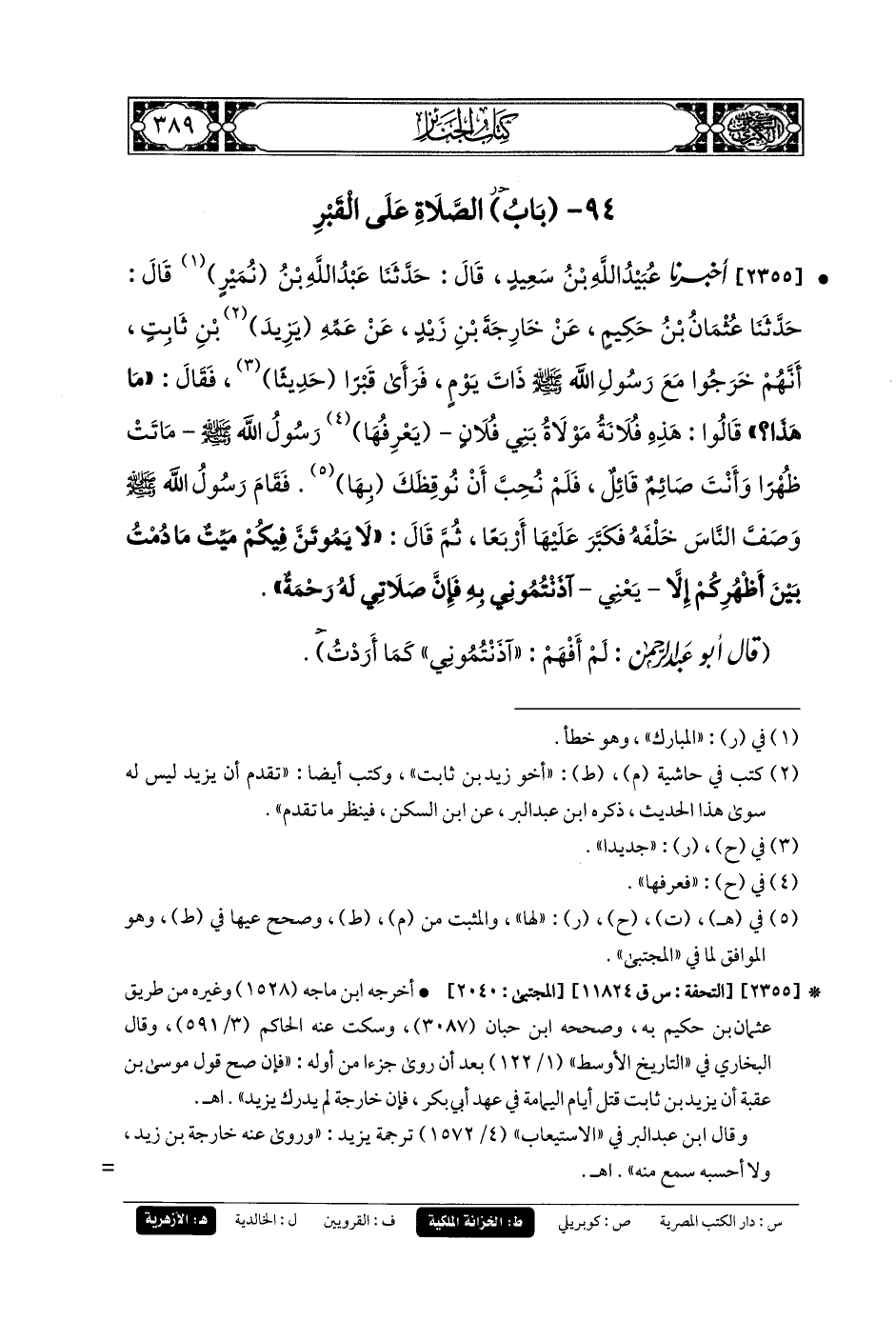 2355- أَخبَرنا عُبَيدُ اللهِ بنُ سَعِيدٍ، قَالَ: حَدثنا عَبدُ اللهِ بنُ نُمَيْرٍ، قَالَ: حَدثنا عُثْمَانُ بنُ حَكِيمٍ، عَنْ خَارِجَةَ بْنِ زَيْدٍ، عَنْ عَمِّهِ يَزِيدَ بْنِ ثَابِتٍ، أَنَّهُمْ خَرَجُوا مَعَ رَسُولِ اللهِ صَلى الله عَليه وسَلم ذَاتَ يَوْمٍ، فَرَأَى قَبْرًا حَدِيثًا، فَقَالَ: مَا هَذَا؟ قَالُوا: هَذِهِ فُلاَنَةُ مَوْلاَةُ بَنِي فُلاَنٍ، يَعْرِفُهَا رَسُولُ اللهِ صَلى الله عَليه وسَلم، مَاتَتْ ظُهْرًا وَأَنْتَ صَائِمٌ قَائِلٌ، فَلَمْ نُحِبَّ أَنْ نُوقِظَكَ بِهَا، فَقَامَ رَسُولُ اللهِ صَلى الله عَليه وسَلم وَصَفَّ النَّاسَ خَلْفَهُ، فَكَبَّرَ عَلَيْهَا أَرْبَعًا، ثُمَّ قَالَ: لاَ يَمُوتَنَّ فِيكُمْ مَيِّتٌ مَا دُمْتُ بَيْنَ أَظْهُرِكُمْ إِلاَّ، يَعْنِي، آذَنْتُمُونِي بِهِ، فَإِنَّ صَلاَتِي لَهُ رَحْمَةٌ.