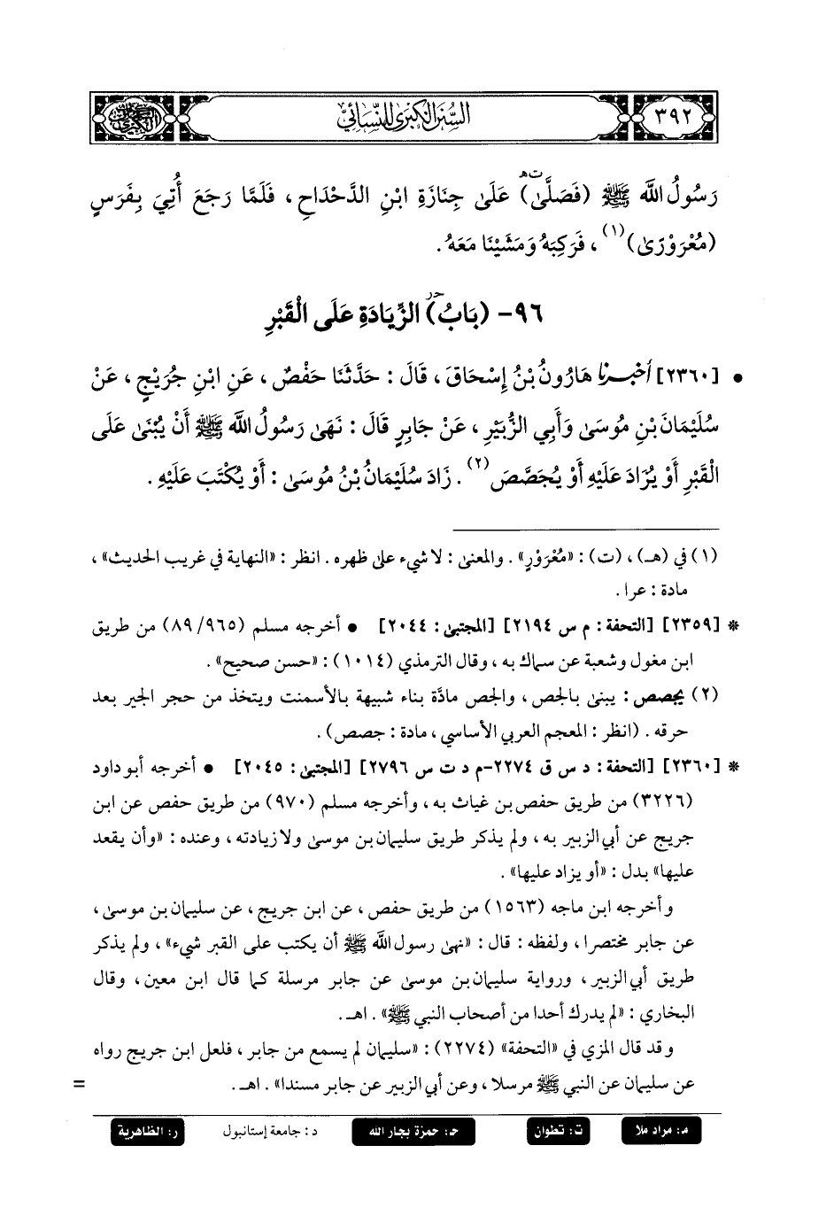 2360- أَخبَرنا هَارُونُ بنُ إِسْحَاقَ، قَالَ: حَدثنا حَفْصٌ، عَنِ ابنِ جُرَيْجٍ، عَنْ سُلَيمَانَ بْنِ مُوسَى، وَأَبِي الزُّبَيْرِ، عَنْ جَابِرٍ قَالَ: نَهَى رَسُولُ اللهِ صَلى الله عَليه وسَلم أَنْ يُبْنَى عَلَى القَبْرِ أَوْ يُزَادَ عَلَيْهِ أَوْ يُجَصَّصَ، زَادَ سُلَيمَانُ بنُ مُوسَى: أَوْ يُكْتَبَ عَلَيْهِ.