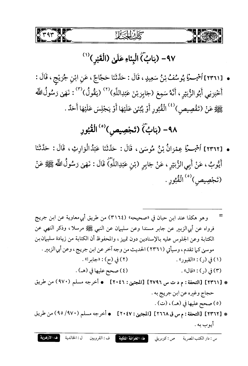 2361- أَخبَرنا يُوسُفُ بنُ سَعِيدٍ، قَالَ: حَدثنا حَجَّاجٌ، عَنِ ابنِ جُرَيْجٍ، قَالَ: أَخبَرني أَبُو الزُّبَيْرِ، أَنَّهُ سَمِعَ جَابِرَ بْنَ عَبدِ اللهِ يَقُولُ: نَهَى رَسُولُ اللهِ صَلى الله عَليه وسَلم عَنْ تَقْصِيصِ القُبُورِ، أَوْ يُبْنَى عَلَيْهَا، أَوْ يَجْلِسُ عَلَيْهَا أَحَدٌ.