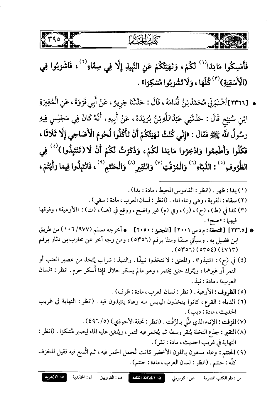 2366- أَخبَرني مُحَمدُ بنُ قُدَامَةَ، قَالَ: حَدثنا جَرِيرٌ، عَنْ أَبِي فَرْوَةَ، عَنِ المُغِيرَةِ بْنِ سُبَيْعٍ، قَالَ: حَدَّثَنِي عَبدُ اللهِ بنُ بُرَيْدَةَ، عَنْ أَبِيهِ، أَنَّهُ كَانَ فِي مَجْلِسٍ فِيهِ رَسُولُ اللهِ صَلى الله عَليه وسَلم فَقَالَ: إِنِّي كُنْتُ نَهَيْتُكُمْ أَنْ تَأْكُلُوا لُحُومَ الأَضَاحِيِّ إِلاَّ ثَلاَثًا، فَكُلُوا وَأَطْعِمُوا وَادَّخِرُوا مَا بَدَا لَكُمْ، وَذَكَرْتُ لَكُمْ أَنْ لاَ تَنْتَبِذُوا فِي الظُّرُوفِ الدُّبَّاءَ وَالمُزَفَّتَ وَالنَّقِيرَ وَالحَنْتَمَ انْتَبِذُوا فِيمَا رَأَيْتُمْ، وَاجْتَنِبُوا كُلَّ مُسْكِرٍ، ونَهَيْتُكُمْ عَنْ زِيَارَةِ القُبُورِ، فَمَنْ أَرَادَ أَنْ يَزُورَ قَبْرًا فَلْيَزُرْه وَلاَ تَقُولُوا هُجْرًا.