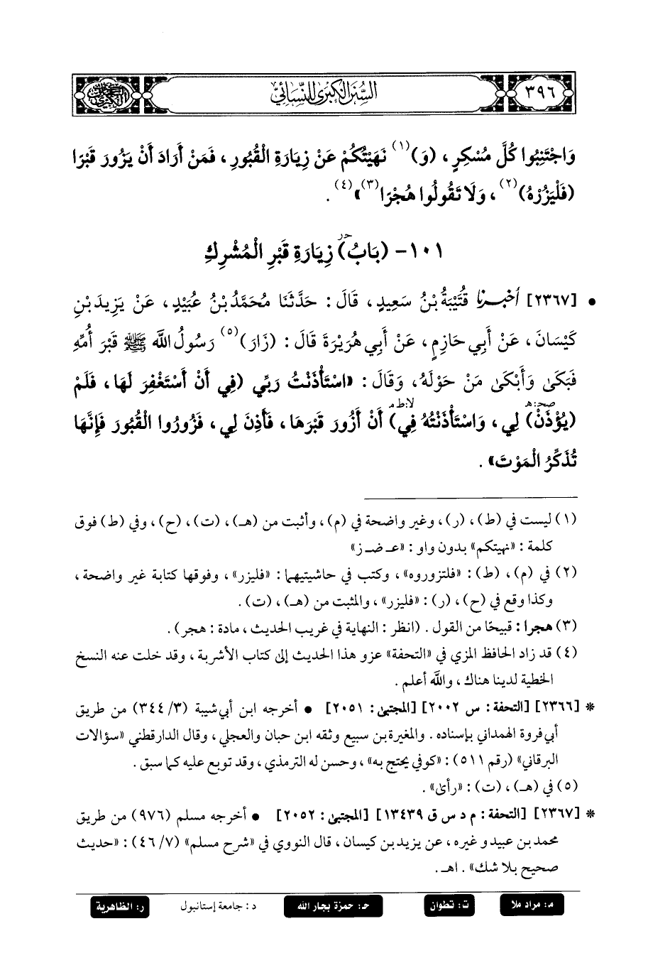 2367- أَخبَرنا قُتَيبَةُ بنُ سَعِيدٍ، قَالَ: حَدثنا مُحَمدُ بنُ عُبَيدٍ، عَنْ يَزِيدَ بْنِ كَيْسَانَ، عَنْ أَبِي حَازِمٍ، عَنْ أَبِي هُرَيرَةَ قَالَ: زَارَ رَسُولُ اللهِ صَلى الله عَليه وسَلم قَبْرَ أُمِّهِ فَبَكَى وَأَبْكَى مَنْ حَوْلَهُ، وَقَالَ: اسْتَأْذَنْتُ رَبِّي فِي أَنْ أَسْتَغْفِرَ لَهَا فَلَمْ يَأْذَنْ لِي، وَاسْتَأْذَنْتُهُ فِي أَنْ أَزُورَ قَبْرَهَا فَأَذِنَ لِي، فَزُورُوا القُبُورَ فَإِنَّهَا تُذَكِّرُ المَوْتَ.
