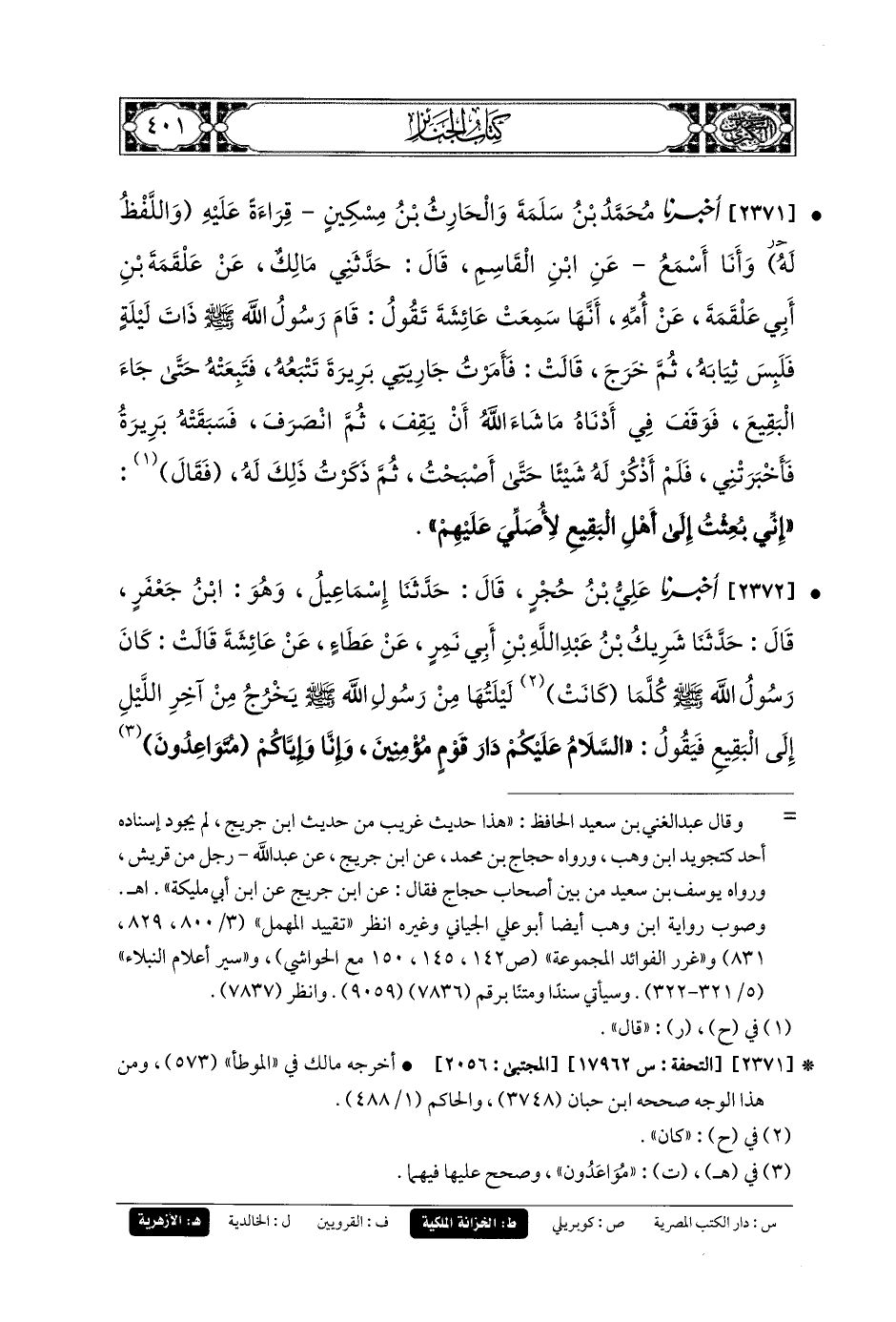 2371- أَخبَرنا مُحَمدُ بنُ سَلَمَةَ، وَالحَارِثُ بنُ المِسْكِينٍ، قِرَاءَةً عَلَيْهِ، وَاللَّفْظُ لَهُ، وَأَنَا أَسْمَعُ، عَنِ ابنِ القَاسِمِ، قَالَ: حَدَّثَنِي مَالِكٌ، عَنْ عَلْقَمَةَ بْنِ أَبِي عَلْقَمَةَ، عَنْ أُمِّهِ، أَنَّهَا سَمِعْتُ عَائِشَةَ تَقُولُ: قَامَ رَسُولُ اللهِ صَلى الله عَليه وسَلم ذَاتَ لَيْلَةٍ فَلَبِسَ ثِيَابَهُ، ثُمَّ خَرَجَ، قَالَتْ: فَأَمَرْتُ جَارِيَتِي بَرِيرَةَ تَتْبَعُهُ، فَتَبِعَتْهُ حَتَّى جَاءَ البَقِيعَ، فَوَقَفَ فِي أَدْنَاهُ مَا شَاءَ اللهُ أَنْ يَقِفَ، ثُمَّ انْصَرَفَ، فَسَبَقَتْهُ بَرِيرَةُ فَأَخبَرَتْنِي، فَلَمْ أَذْكُرْ لَهُ شَيْئًا حَتَّى أَصْبَحْتُ، ثُمَّ ذَكَرْتُ ذَلِكَ لَهُ، فَقَالَ: إِنِّي بُعِثْتُ إِلَى أَهْلِ البَقِيعِ لأُصَلِّيَ عَلَيْهِمْ.