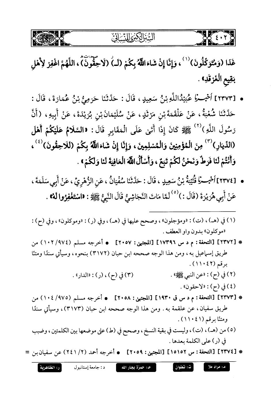 2373- أَخبَرنا عُبَيدُ اللهِ بنُ سَعِيدٍ، قَالَ: حَدثنا حَرَمِيُّ بنُ عُمَارَةَ، قَالَ: حَدثنا شُعبَةُ، عَنْ عَلْقَمَةَ بْنِ مَرْثَدٍ، عَنْ سُلَيمَانَ بْنِ بُرَيْدَةَ، عَنْ أَبِيهِ، أَنَّ رَسُولَ اللهِ صَلى الله عَليه وسَلم كَانَ إِذَا أَتَى عَلَى المَقَابِرِ قَالَ: السَّلاَمُ عَلَيْكُمْ أَهْلَ الدِّيَارِ مِنَ المُؤْمِنِينَ وَالمُسْلِمِينَ، وَإِنَّا إِنْ شَاءَ اللهُ بِكُمْ لَلاَحِقُونَ، أَنْتُمْ لَنَا فَرَطٌ، وَنَحْنُ لَكُمْ تَبَعٌ، أَسْأَلُ اللهَ العَافِيَةَ لَنَا وَلَكُمْ.