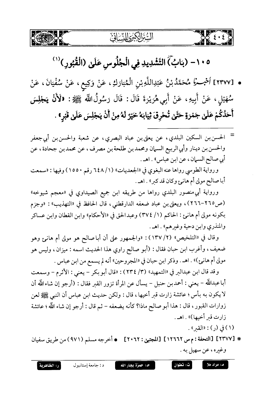 2377- أَخبَرنا مُحَمدُ بنُ عَبدِ اللهِ بْنِ المُبَارَكِ، عَنْ وَكِيعٍ، عَنْ سُفْيَانَ، عَنْ سُهَيلٍ، عَنْ أَبِيهِ، عَنْ أَبِي هُرَيرَةَ قَالَ: قَالَ رَسُولُ اللهِ صَلى الله عَليه وسَلم: لأَنْ يَجْلِسَ أَحَدُكُمْ عَلَى جَمْرَةٍ حَتَّى تَحْرِقَ ثِيَابَهُ خَيْرٌ لَهُ مِنْ أَنْ يَجْلِسَ عَلَى قَبْرٍ.