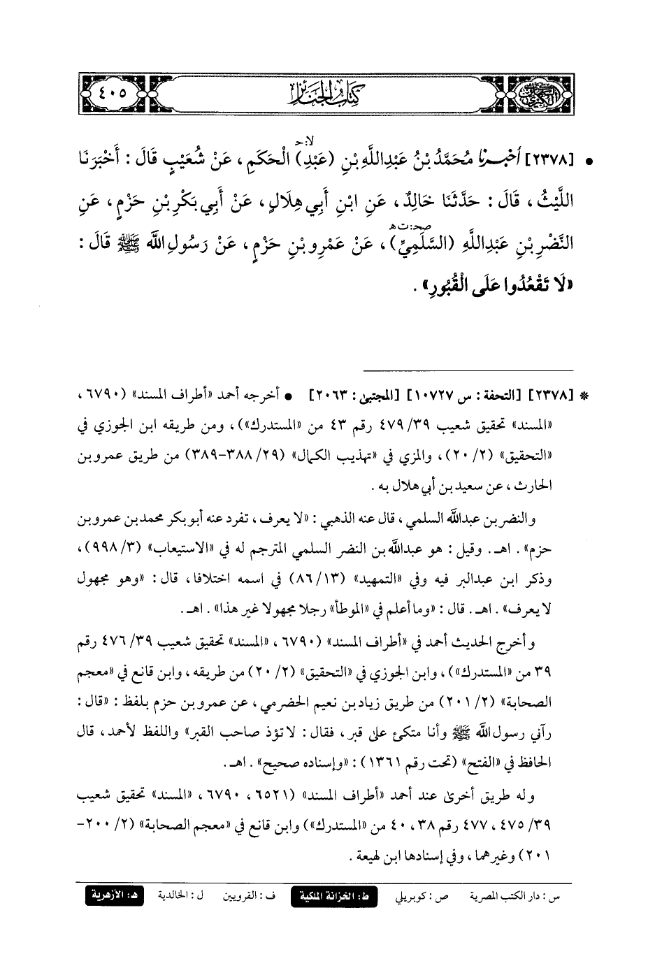 2378- أَخبَرنا مُحَمدُ بنُ عَبدِ اللهِ بْنِ عبد الحَكَمِ، عَنْ شُعَيبٍ، قَالَ: أَخبَرنا اللَّيْثُ، قَالَ: حَدثنا خَالِدٌ، عَنِ ابنِ أَبِي هِلاَلٍ، عَنْ أَبِي بَكْرِ بْنِ حَزْمٍ، عَنِ النَّضْرِ بْنِ عَبدِ اللهِ السُّلَمِيِّ، عَنْ عَمْرِو بْنِ حَزْمٍ، عَنْ رَسُولِ اللهِ صَلى الله عَليه وسَلم قَالَ: لاَ تَقْعُدُوا عَلَى القُبُورِ.