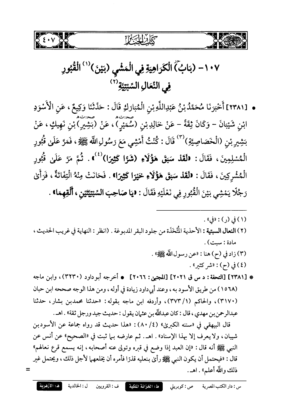 107- بابُ الكَرَاهِيَةِ فِي المَشْيِ بَيْنَ القُبُورِ فِي النِّعَالِ السِّبْتِيَّةِ.