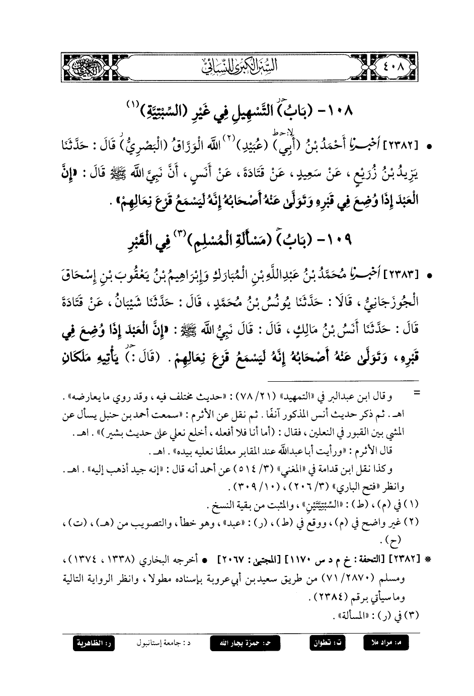2382- أَخبَرنا أَحْمَدُ بنُ أَبِي عُبَيدِ اللهِ الوَرَّاقُ البصري، قَالَ: حَدثنا يَزِيدُ بنُ زُرَيْعٍ، عَنْ سَعِيدٍ، عَنْ قَتَادَةَ، عَنْ أَنَسٍ، أَنَّ نَبِيَّ اللهِ صَلى الله عَليه وسَلم قَالَ: إِنَّ العَبدَ إِذَا وُضِعَ فِي قَبْرِهِ وَتَوَلَّى عَنْهُ أَصْحَابُهُ إِنَّهُ لَيَسْمَعُ قَرْعَ نِعَالِهِمْ.
